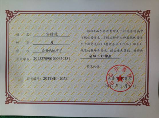 思想上积极要求上进,学习勤奋刻苦,努力钻研,高一暑假考试获得年级第一,高二历次考试始终名列年级第二;担任班干部工作认真细致,脚踏实地;生活勤俭节约,乐于助人,实践能力强,是一名德、智、体全面发展的优秀学生,2017年2月被评为山东省三好学生,每学期均被评为校三好学生,多次被评为校学习十佳和年级学习十佳。