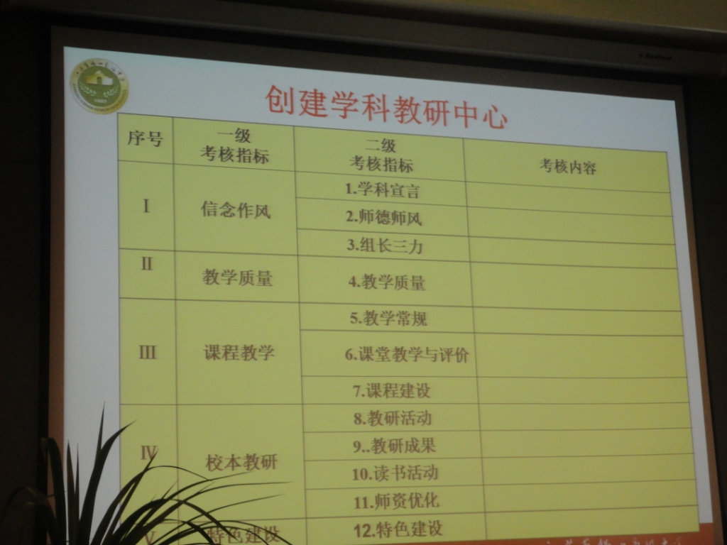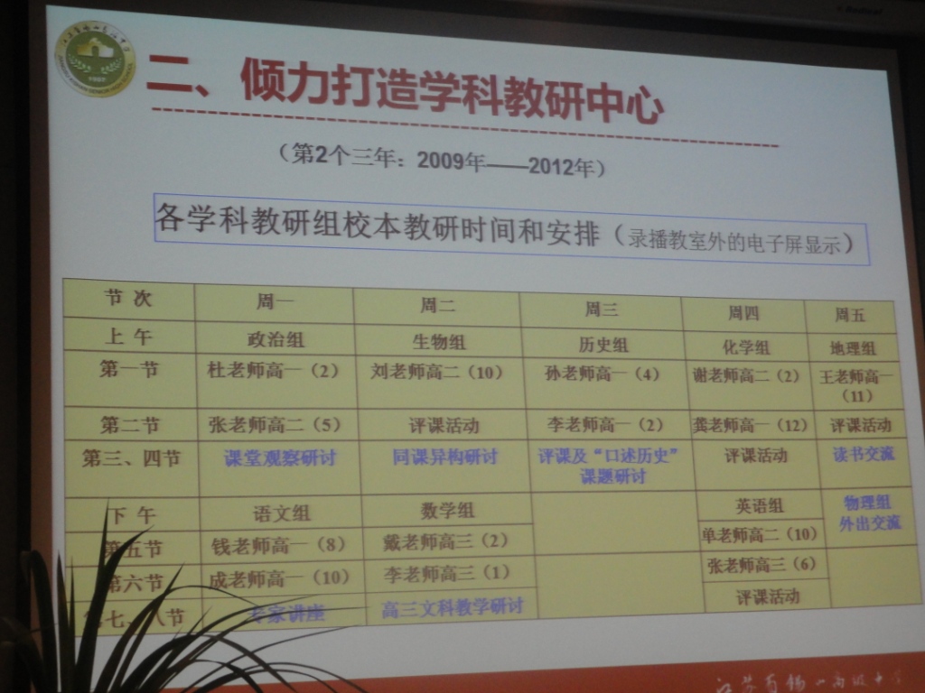 第一阶段(2007年——2009年)找回教研组和教研组长:强调了教研组的职能:教研组是校本教研的基点和考核对象,是学校教研的主角(组长是教研组的灵魂)。打造组长“三力”工程:凝聚力、感召力、影响力。明确学科教研的方向:以课程开发和课堂有效教学为重点研究内容,以教学案例研究为基本的研究方式,以教学质量的提高和教师专业发展为目的。三年下来,教研组重又回到了学校(原来职能混乱)。各教研组致力于集体打造富有学科特色的教学研究。