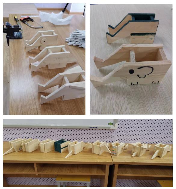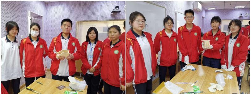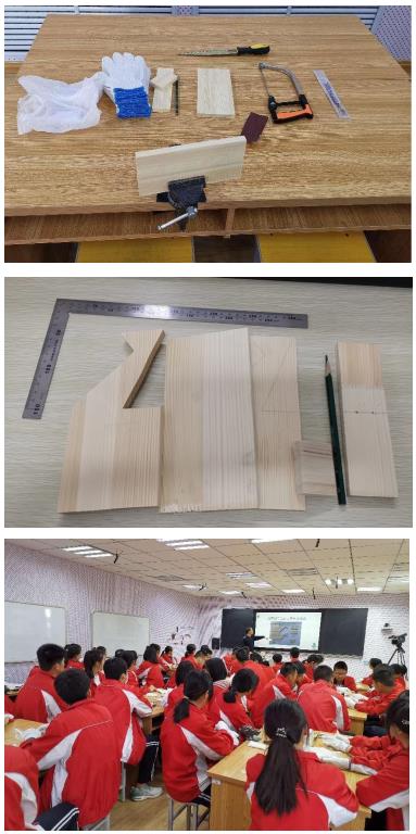 活动前,通用技术教师制作了视频和课件,对各种工具的操作规范以及注意事项进行讲解,重点强调安全注意事项。教师为十个学生小组准备好木料,指导学生根据木工加工工艺的具体方法步骤,使用台钳、手工锯、锉刀、砂纸、胶水等工具,按照画线、锯割、打磨、胶粘的制作过程,完成自己的作品。
