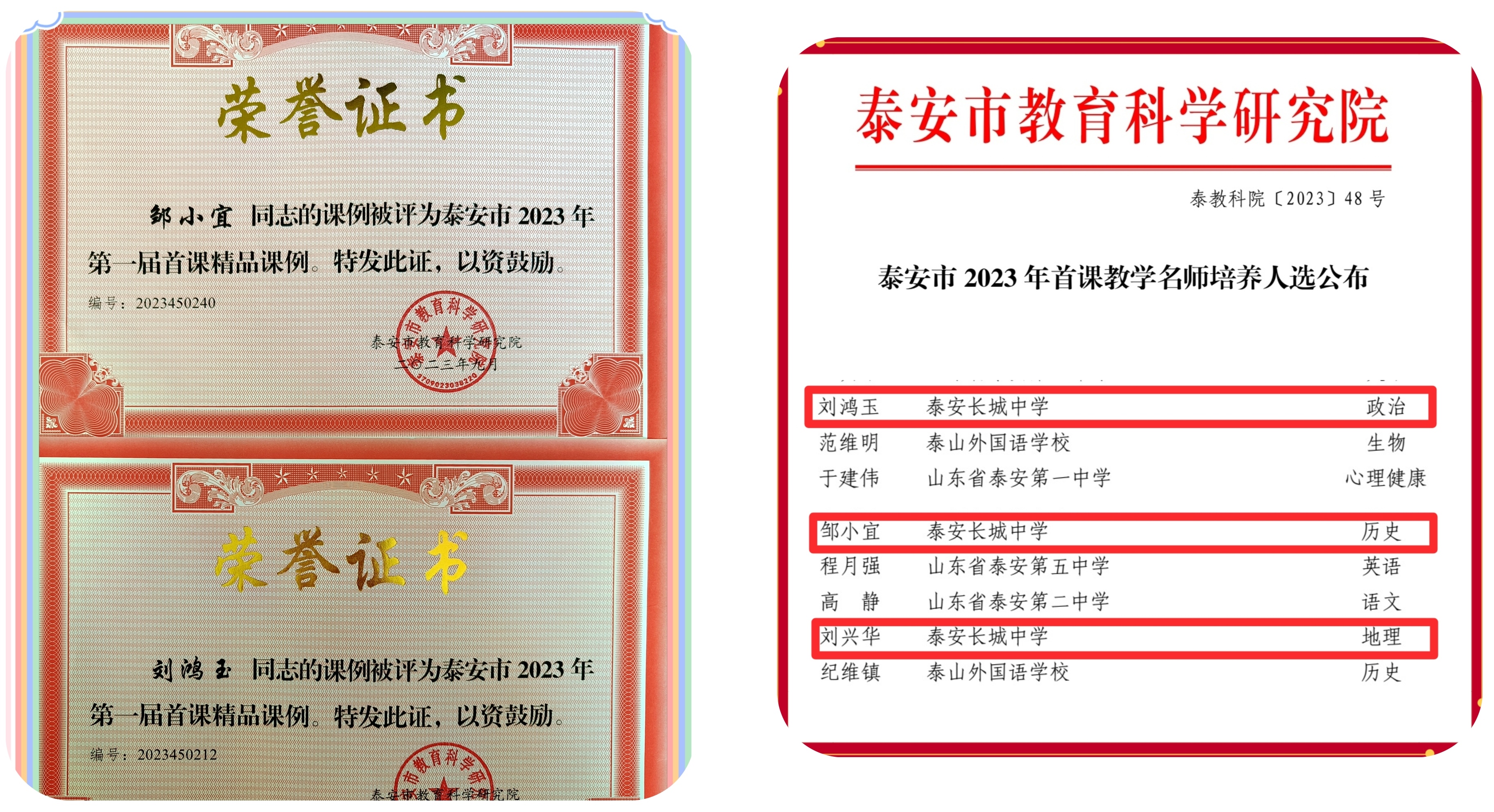 近日,在泰安市2023年首课精品课例展评活动评选中,德赢天下_www.vwin01.com邹小宜、刘鸿玉老师的首课被评为“泰安市2023年首课精品课例”,邹小宜、刘鸿玉、刘兴华三位教师并被评为“泰安市首课名师”。