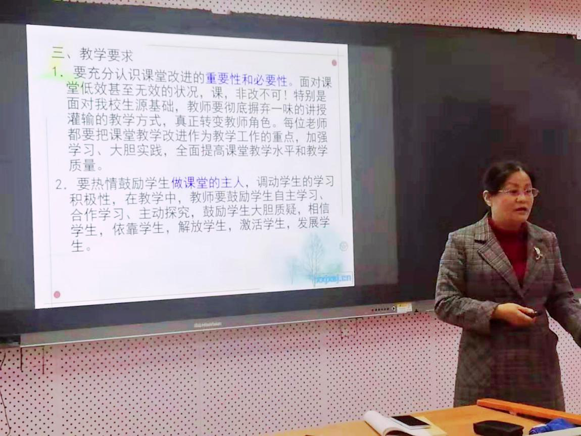 教务处夏冰副主任强调了做好常规教学工作的重要性,详细解读了学校的教学常规细则,结合学校常规检查的具体规定,从备课、上课、编制导学案、批改作业、集体教研、命题评价、工作总结等各个环节提出了具体要求。希望老师们把常规教学抓实、抓牢,尽快成长为优秀教师。