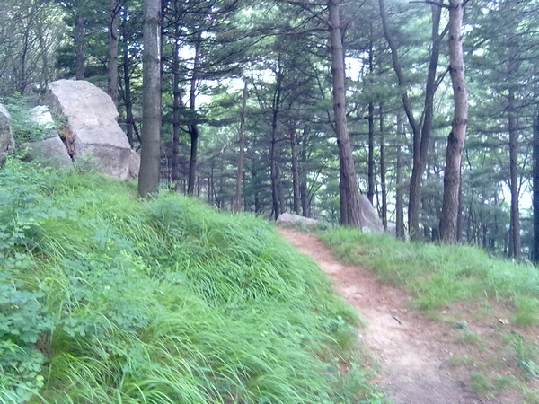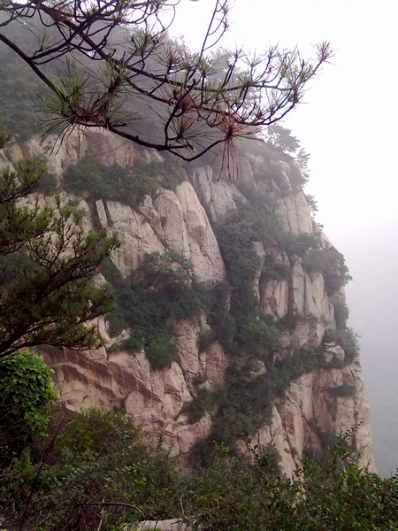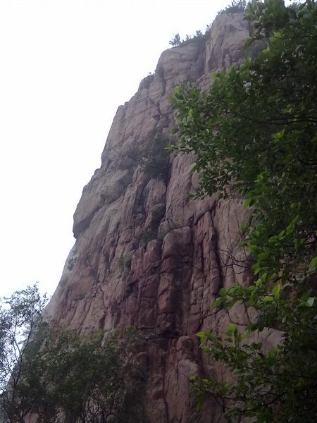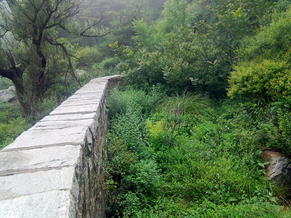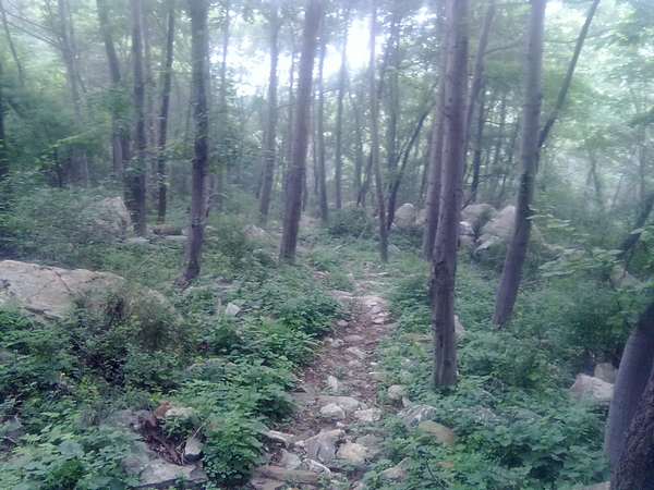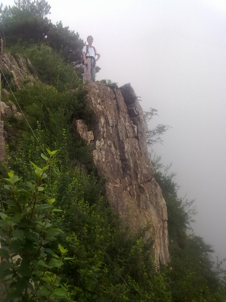 七月下旬的一个周末。 按惯例,驴友乐山老师打电话约我爬山:“今天去帽檐山吧?” “行!”整好行装,其实也就是一个帽子,一个背包,两张煎饼,几块咸菜,几瓶水而已,很快下楼,乐山和泥巴两位老师已在车中等候。 刚下过雨,但天依旧是阴的。 我们设计的路线是:天外村------竹林寺-------大虎峪-------龙角口-------帽檐山--------登山盘道---------中天门--------天外村。 从天外村到龙角口,一直是在登高,先是盘山公路,然后是大虎峪的平缓土路,然后从“老胡家”(登山途中的一户农家)往上是不规整和年久失修的台阶盘道,盛夏酷暑季节,这段路走起来感觉还是蛮费力的。 因为泥巴老师是第一次走这条线路,且没有到过九女寨,在龙角口的下面,我们决定先拐向九女寨。