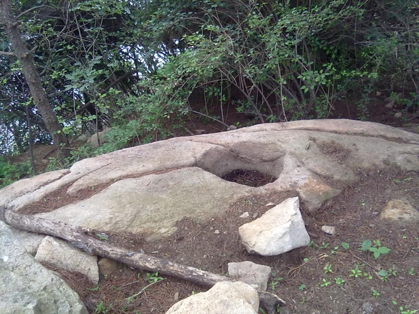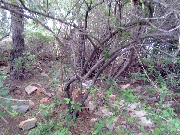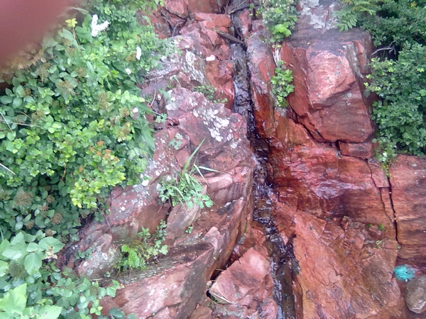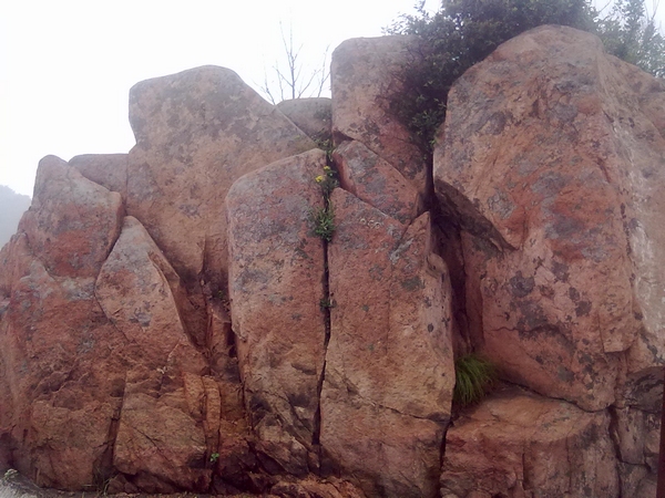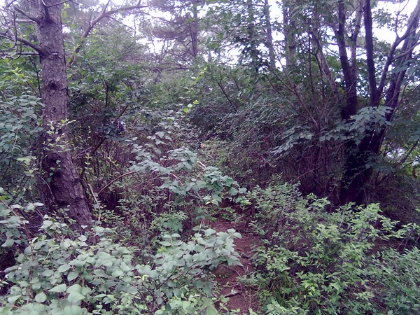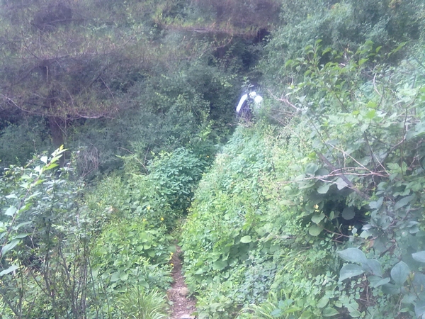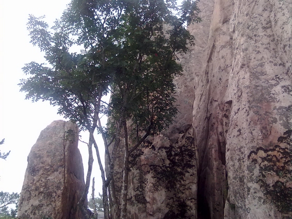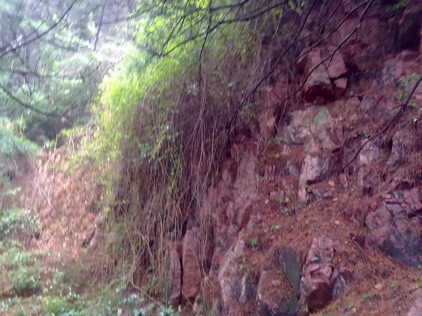 从观日台处顺小路而下,道路极其窄狭,而且荆棘丛生,走之不易。