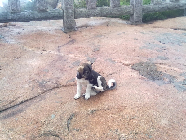 古朴的观日台上,偌大的场地空无一人,只有一条小狗很友好的跟着我们转来转去。