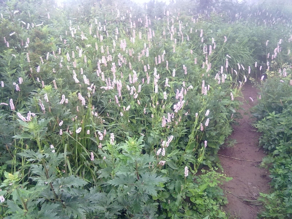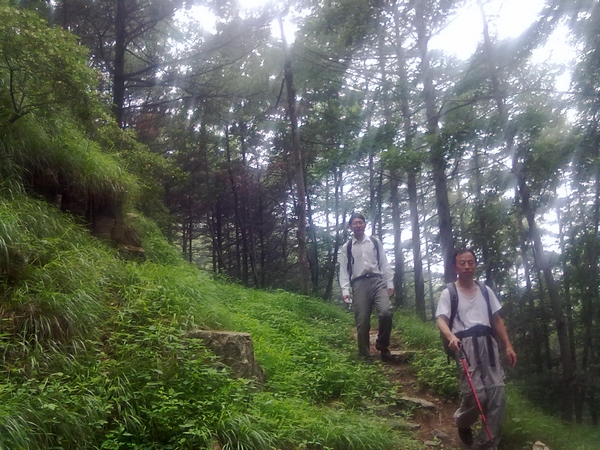 路旁的树木上有很多的水,在前面开路的乐山老师到达盘道的时候,竟然从两只登山鞋里倒出了不少的泥水。 很多地方异常陡峭,正如十八盘一般,甚至直上直下,好在有树木藤萝可以攀援。