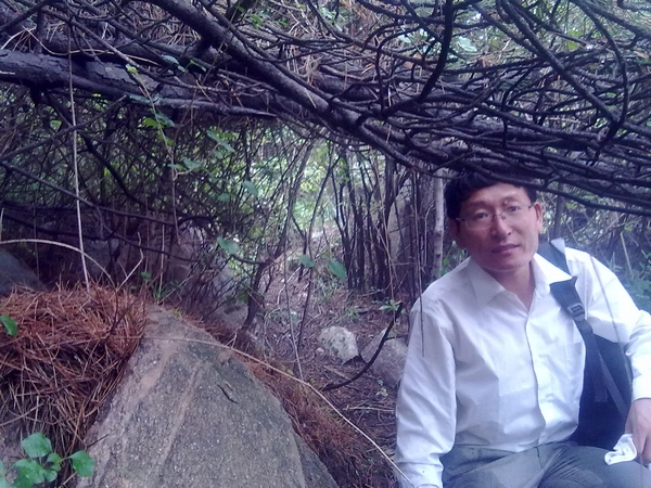 很多时候需要在缠绕的荆棘和树木下钻行,不能直腰,也很难昂首,以至于我的白色的草帽变成了灰色草帽。 看,泥巴老师正在荆棘丛中钻行!