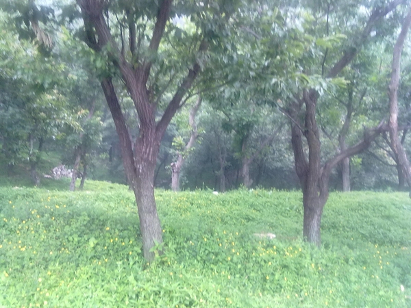 到了三岔林场 翻过龙角口,再往下就是一出三岔路,一处通往桃花峪,一处通往帽檐山至岱顶,我们眼通往帽檐山的小路一路前行,道路虽是不断拔高,但道路平缓,路旁大树林立,草木茂盛。