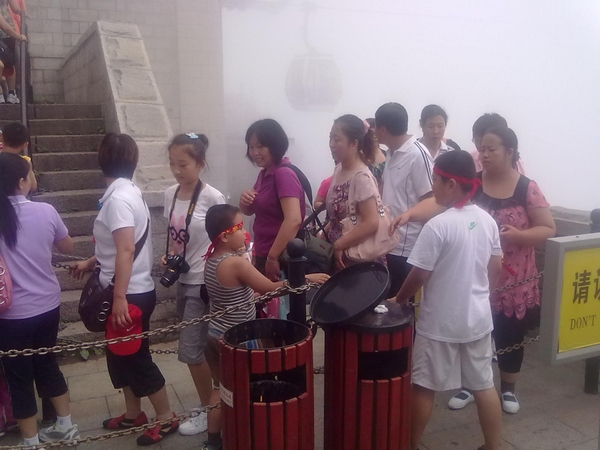 原来这里不是帽檐山,而是岱顶,我们激动和兴奋起来,竟然误打误撞的爬上了岱顶,我们现在所在的山峰就是月观峰,南天门索道站就建在月观峰上,在这里我们看到了大批的等待着做索道上来或下去的游客。
