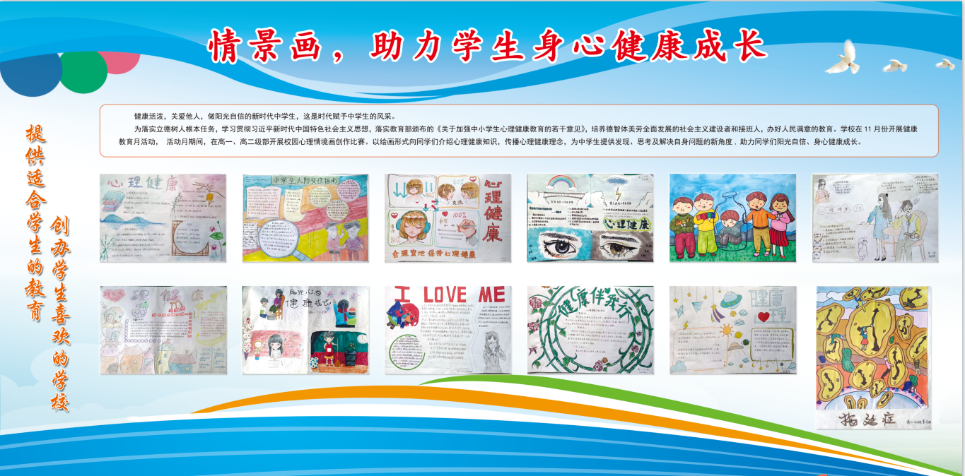 为落实立德树人根本任务,学习贯彻习近平新时代中国特色社会主义思想,落实教育部颁布的《关于加强中小学生心理健康教育的若干意见》,培养德智体美劳全面发展的社会主义建设者和接班人,办好人民满意的教育。学校在11月份开展健康教育月活动, 活动月期间,在高一、高二级部开展校园心理情境画创作比赛。以绘画形式向同学们介绍心理健康知识,传播心理健康理念,为中学生提供发现、思考及解决自身问题的新角度,助力同学们阳光自信、身心健康成长。