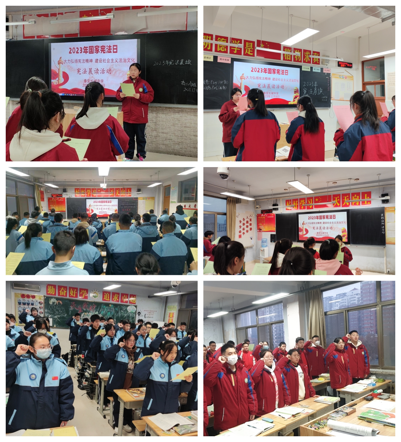 12月4日上午,各班在主持人的带领下齐诵宪法序言及正文中的部分章节、条款,在晨读声中学习宪法法律知识、开展宪法宣誓,理解宪法法律意义,树立宪法法律意识。琅琅书声回荡在校园的各个角落,师生一同感受宪法的权威与力量,加深了对宪法的地位、核心内容以及宪法的重要性的理解,让宪法“声”入人心。