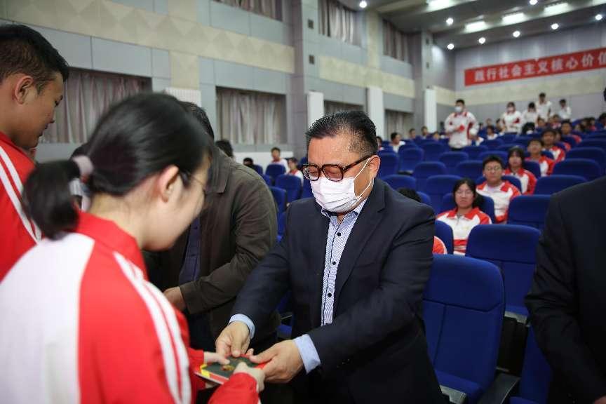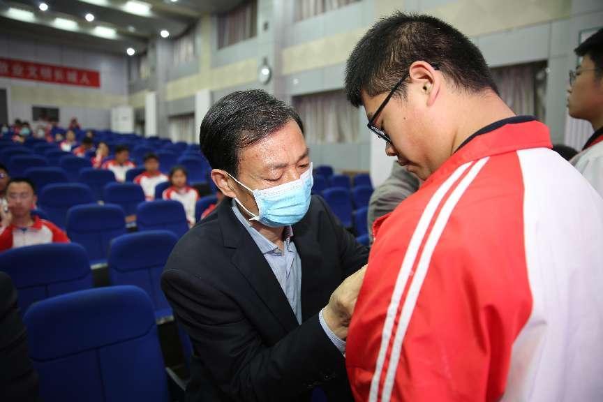 校领导与老团员为47名新团员颁发团员证与团章,佩戴团徽,鲜艳的团徽闪耀着熠熠光芒。