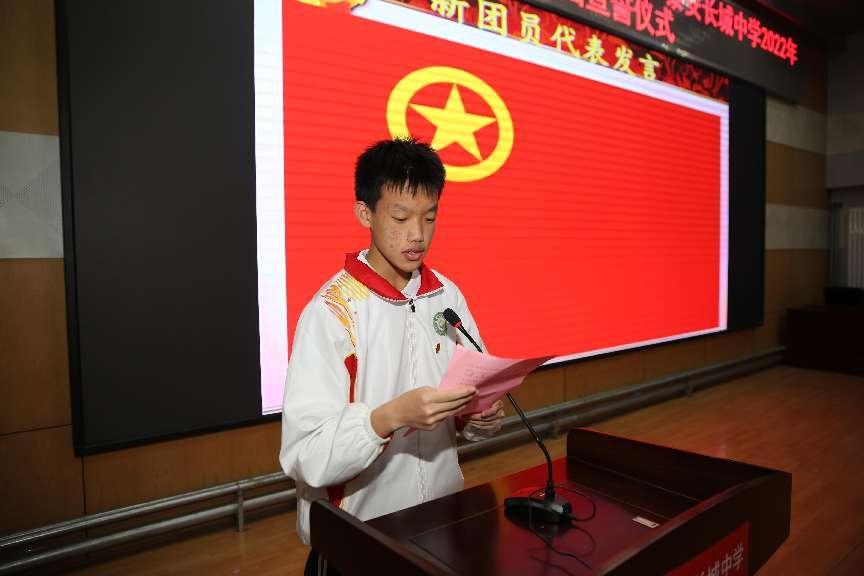 在庄严肃穆的国歌声中,入团仪式拉开帷幕。政教处主任陈长征宣读了2022年新发展团员名单,47名同学光荣加入中国共产主义青年团。