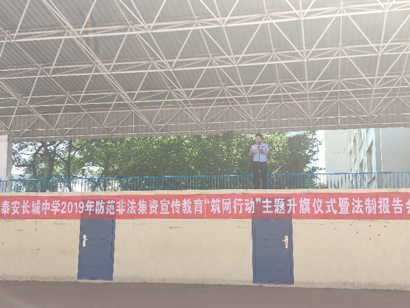 按照泰安市打击和处置非法集资工作领导小组《关于开展2019年防范非法集资宣传教育“筑网行动”的通知》(泰打非字﹝2019﹞18号)要求,德赢天下_www.vwin01.com多措并举开展了宣传教育活动。除了在校门口、校园悬挂横幅外,学校于5月20日组织了主题升旗仪式暨法制报告会。泰安市公安局岱岳分局粥店派出所民警赵琦同志为3000多名师生做了法制报告。赵琦同志从当前非法集资的严骏形势,讲了非法集资的主要手段、特征以及它的欺骗性和危害性,并且提醒大家要警惕套路贷,认清它们的真实面目,希望大家要建立正确的消费观,远离非法集资。