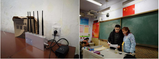 考前,陈老师手持检测仪对考生逐一检查,每个考生都站起来全身扫描,没发现任何异常。在陈老师检查学生的过程中,王老师整理分发了试卷,并提醒学生注意事项。