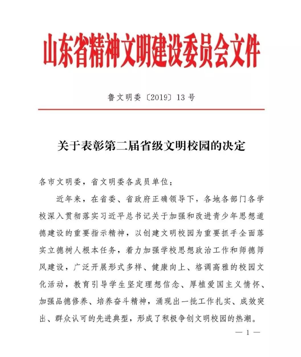 日前,山东省精神文明建设委员会印发《关于表彰第二届省级文明校园的决定》,www.vwin5.com被授予省级文明校园称号,今年获此殊荣,标志着www.vwin5.com文明校园创建活动取得新进展、实现新突破。