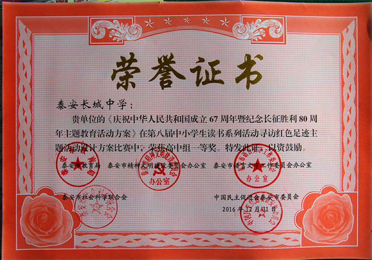 近日结束的泰安市第八届中小学生读书系列活动传来捷报。www.vwin5.com在“寻访红色足迹主题征文”、“寻访红色足迹主题活动设计”、“泰山国学小名士经典诵读电视大赛征文比赛”、“文明基因.孝诚征文”等活动中,荣获22个奖项,其中一等奖6项,二等奖9项,三等奖5项。本次读书系列活动www.vwin5.com参与面广、积极性高,学生踊跃参加,教师认真指导,高妙丽、贾丽老师荣获“优秀指导教师”称号。