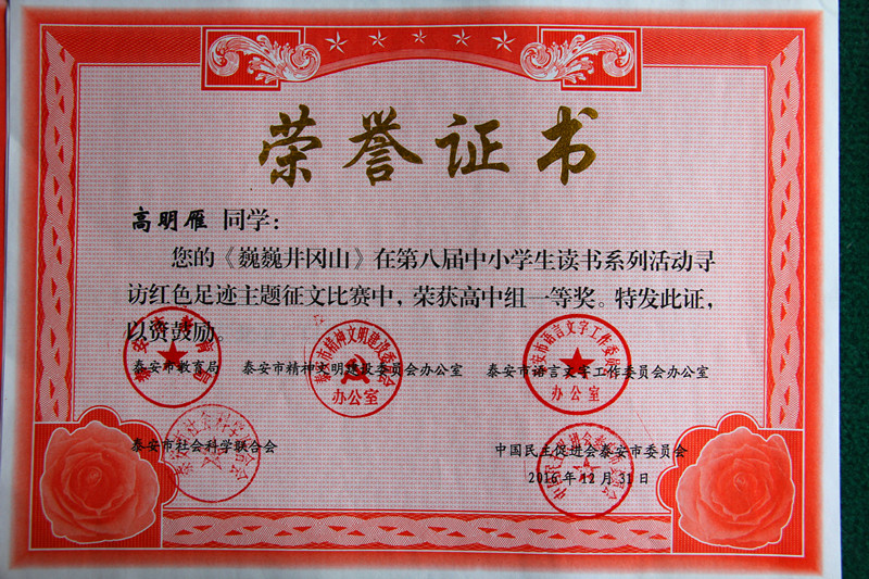 泰安市中小学“文明基因.孝诚爱”征文比赛三等奖: