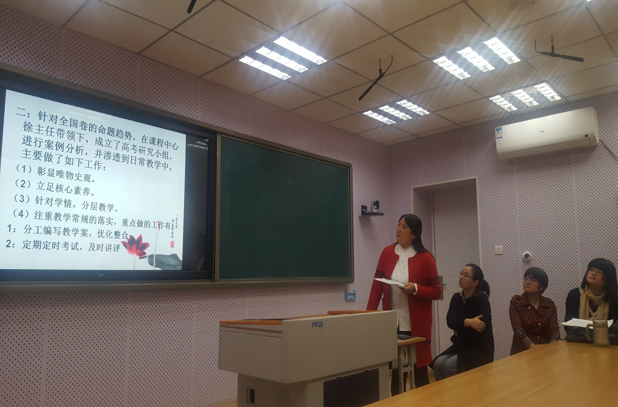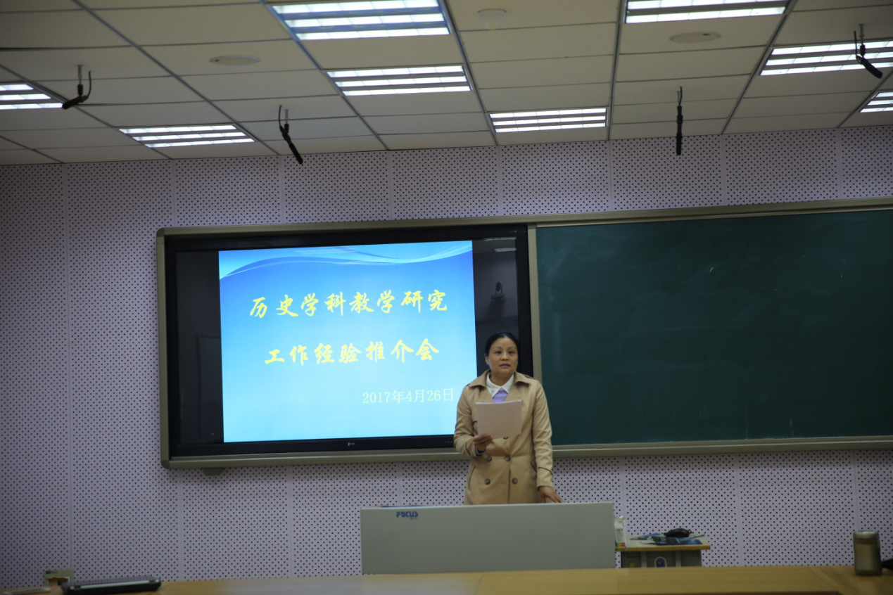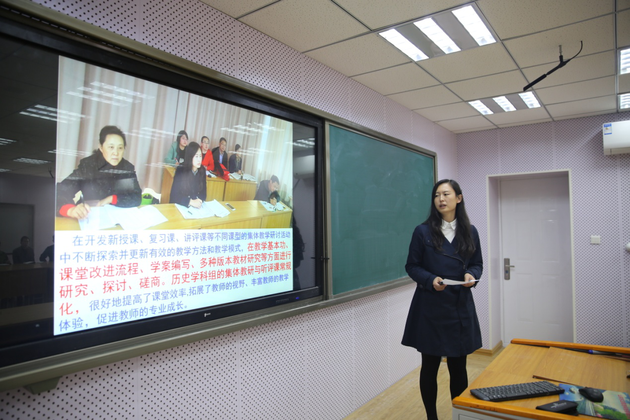 在本次推介会上,历史教研组长高妙丽同志介绍了学科组建设经验,主要内容包括“加强集体教研,抓实教学常规”、“成立历史全国卷研究小组”、“完善历史课堂改进流程”、“加强学案编制”、“增强学生学科核心素养培养”等方面。