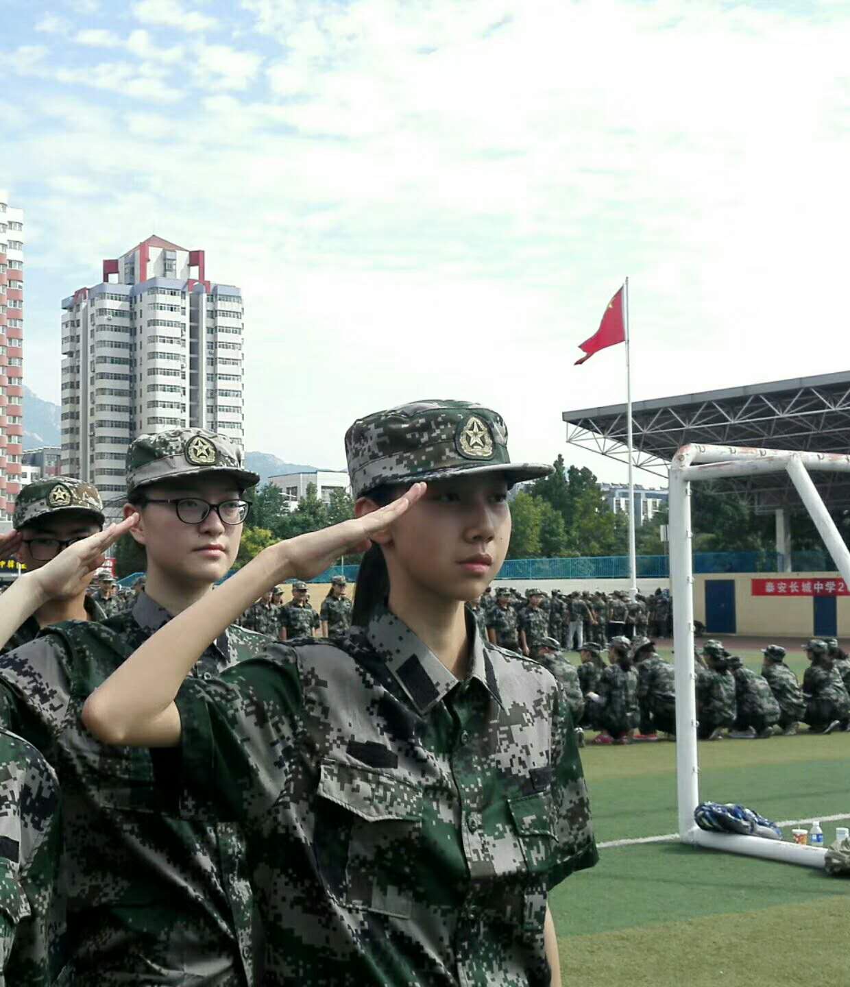 2017级高一新生军训已经进行3天了。与前两天炙热的天气相比,今天的秋雨使得天气凉爽了许多,绿茵茵的场地和同学们的迷彩军装交相辉映,更添青春的风采。