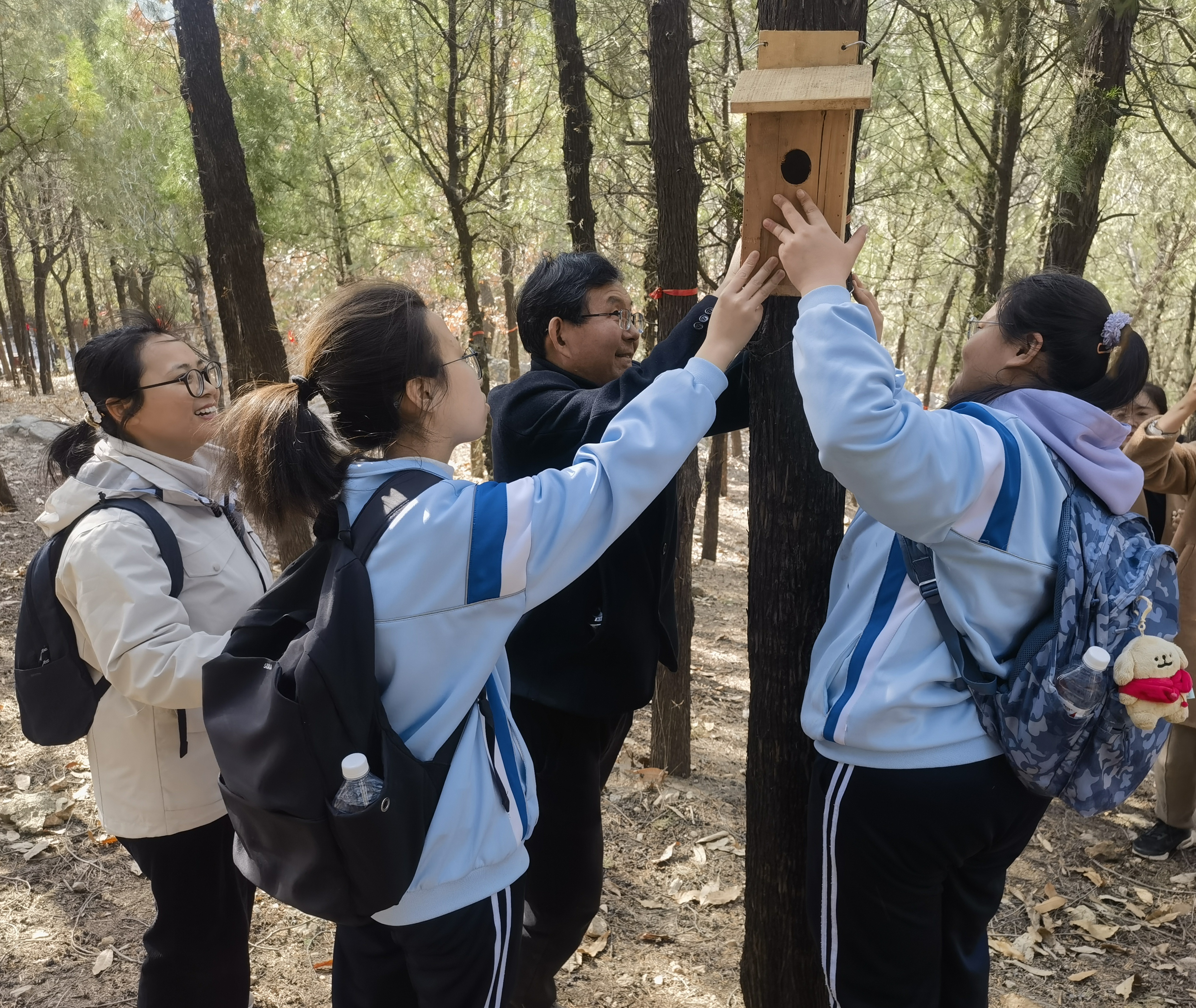 同学们走进冯玉祥纪念馆景点林区,在景区森防站工作人员的指导下用挂鸟巢的方式开展野生动植物保护宣传活动。同学们在活动中互助合作,通过设立人工鸟巢,帮助鸟类抵御初春的寒意。生物组教师向同学们发出爱鸟护鸟、从我做起的倡议,鼓励同学们积极参与野生动植物保护宣传活动,为改善泰山的生态环境质量做出应有的贡献。