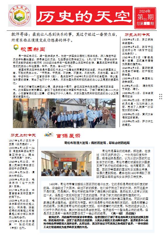 墨色浓重,历史有印。为深入推进历史学科基地建设,提高学生的学习兴趣,增进知识,拓展视野,同时增强教师的课程意识,德赢天下_www.vwin01.com历史教研组精心编制教学简报《历史的天空》,现首期与大家见面啦!