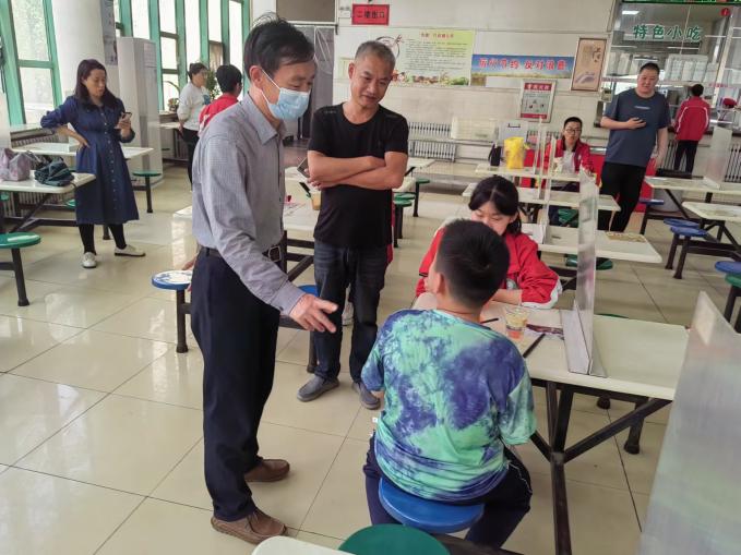 餐厅工作人员向家长介绍餐厅管理、每周营养食谱、学生就餐制度等,部分家长与学生一同就餐,刘校长与陪餐家长亲切交流。