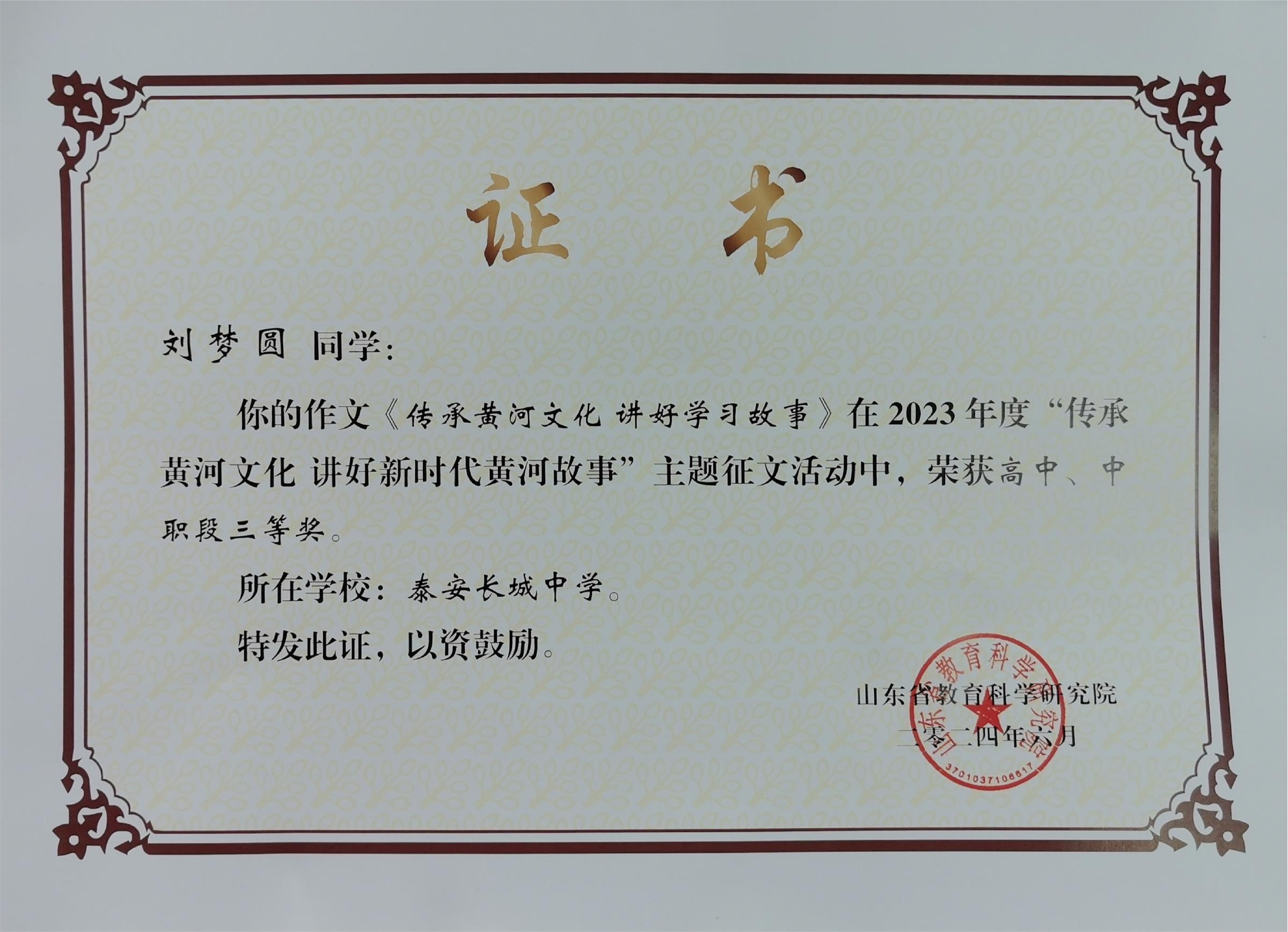 刘梦圆同学荣获省“传承黄河文化,讲好新时代黄河故事”主题征文高中、中职段三等奖,张宏硕、侯斯晨、刘梦圆等3位同学荣获市高中组一等奖,陈文晶、朱芳宇等2同学荣获二等级,申燕老师荣获优秀指导教师奖,刘兴华老师设计的案例《黄河之水》荣获市黄河文化育人优秀案例评选三等奖。
