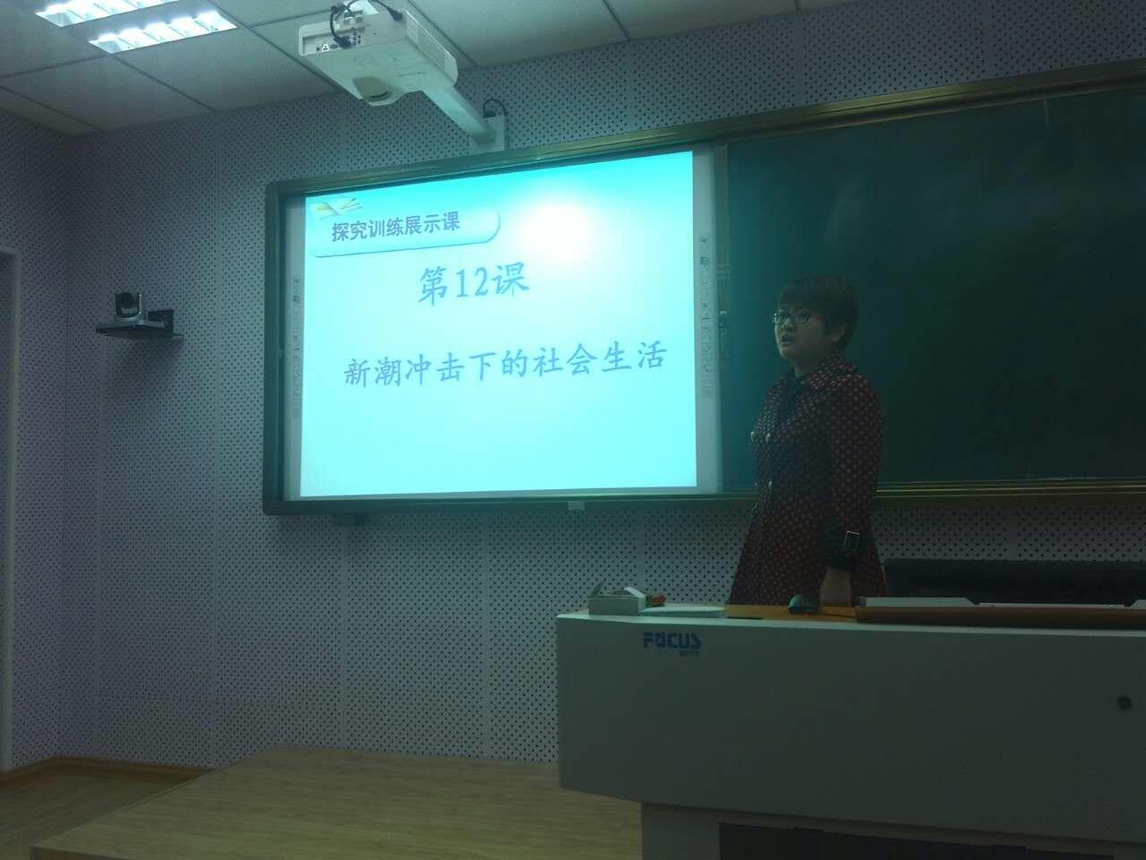 王娟老师的课堂体现了课改的理念和“翻转”的思路,根据学情特点,将“新潮冲击下的社会生活”一课设计为“自学质疑课”和“探究训练展示课”两个课时。“自学质疑课”利用教育云平台实现了在线学习。“探究训练展示课”分作 “学案反馈,解疑释惑”“课标解读,目标展示”“合作探究,剖析主题”“归纳总结,情感升华” 四个环节。学案教学凸显特色,预学案、探究案、固学案三案一体,贯穿教学始终。