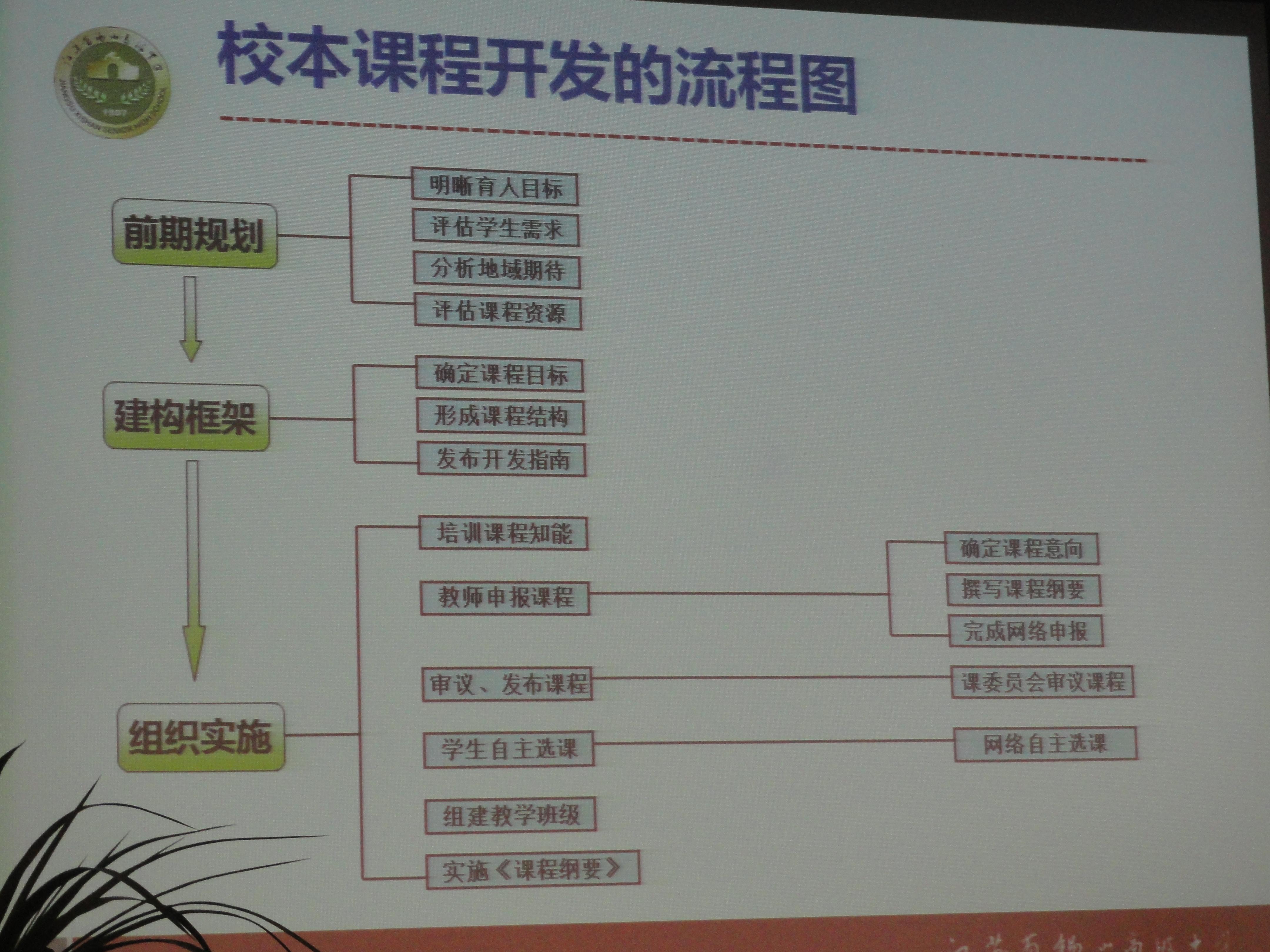 五、校本课程管理的重点:对学生选课的管理;对上课常规的管理;对学生学业成绩的管理;对课程的管理;后续管理机制的建立(循环机制、交流机制、发展机制,激励机制)。