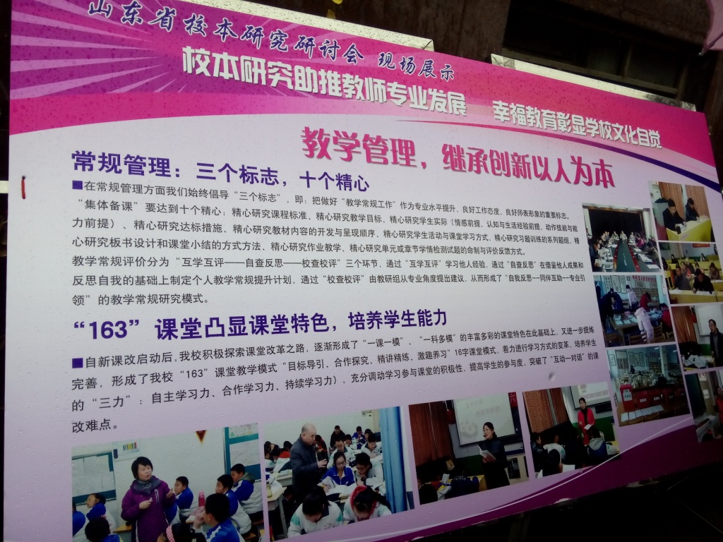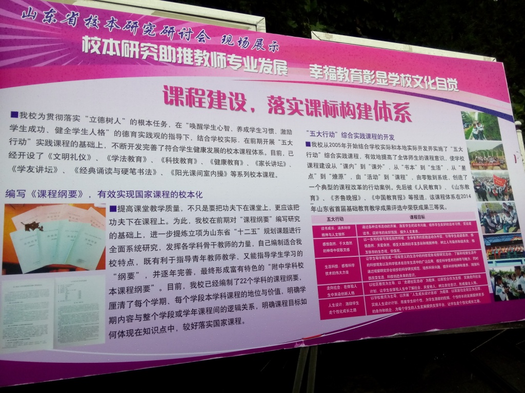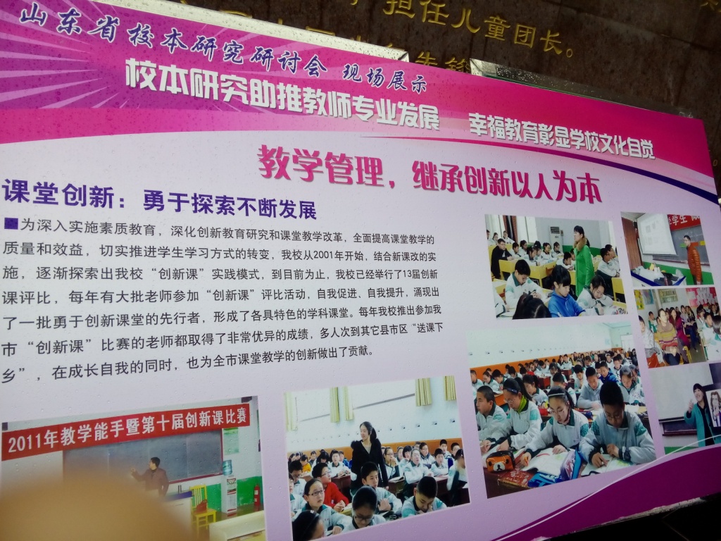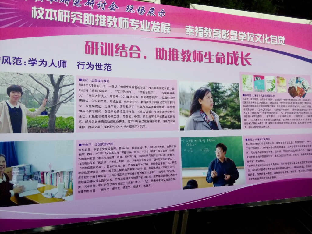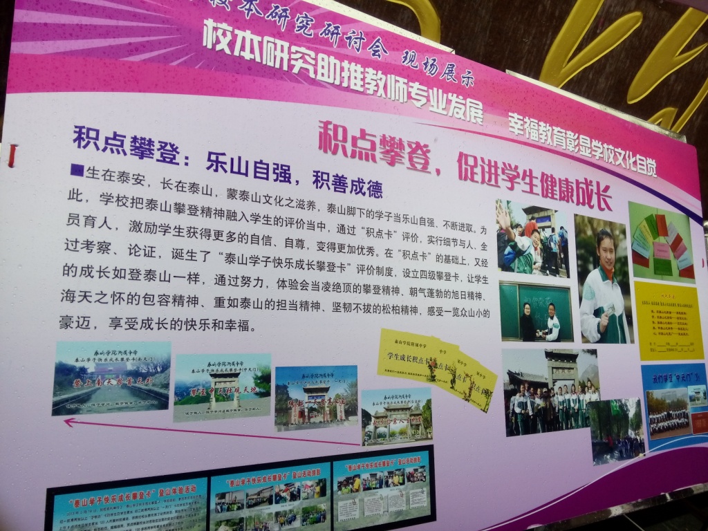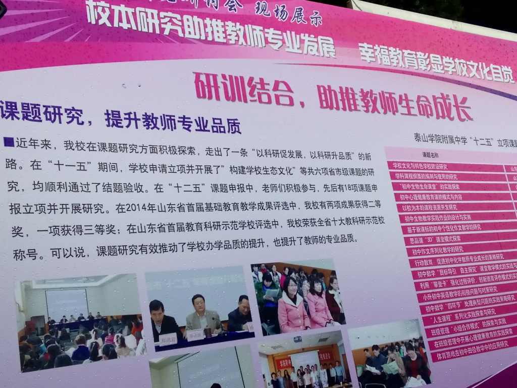 9月28日下午,我随山东省校本研究工作会议的代表观摩了泰山学院附中、泰安英雄山中学和岱岳实验中学的校本研究成果。第一站是泰山学院附中,学校的孙明霞老师带领与会领导和教师参观了宣传展板和展室。