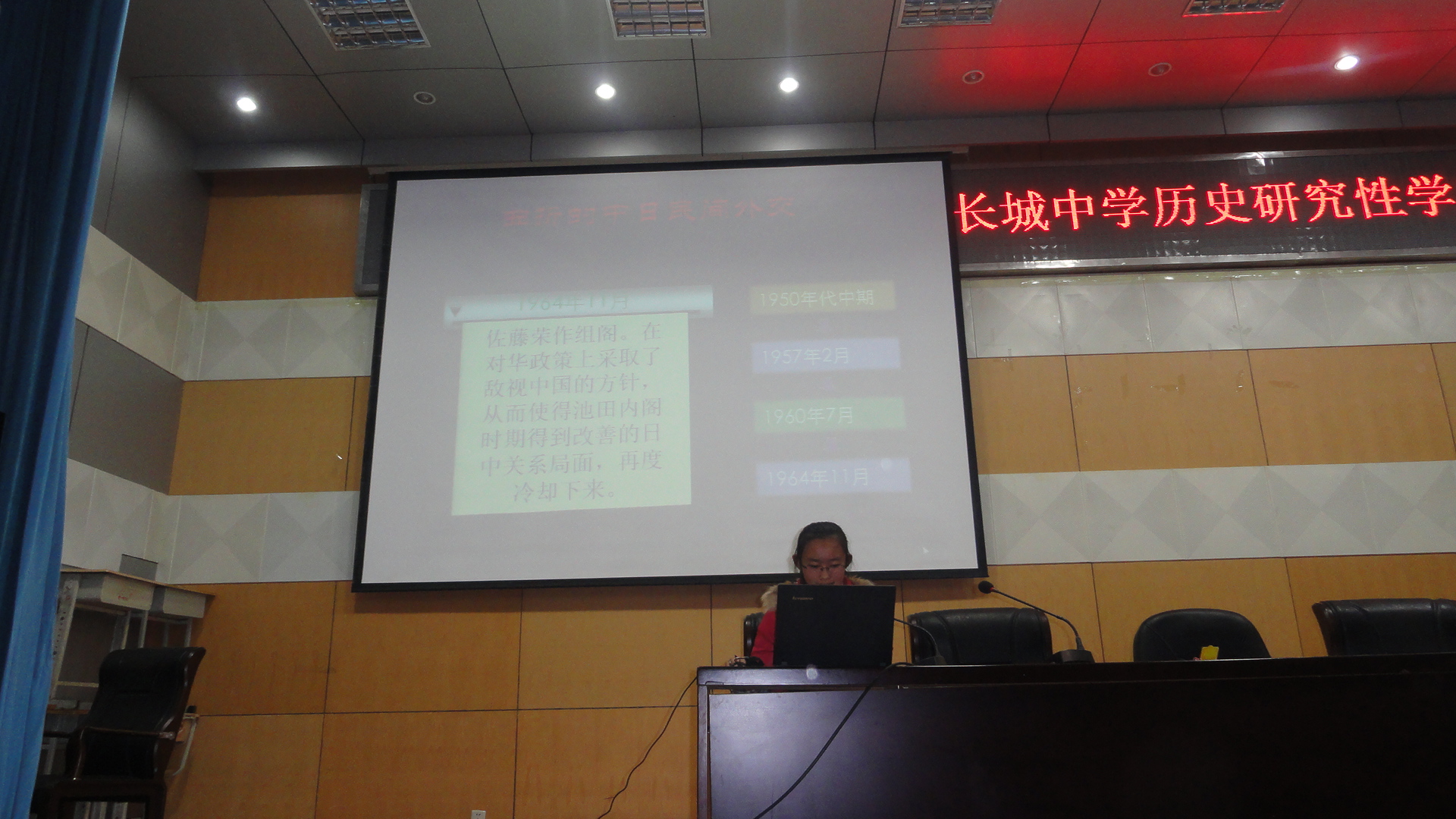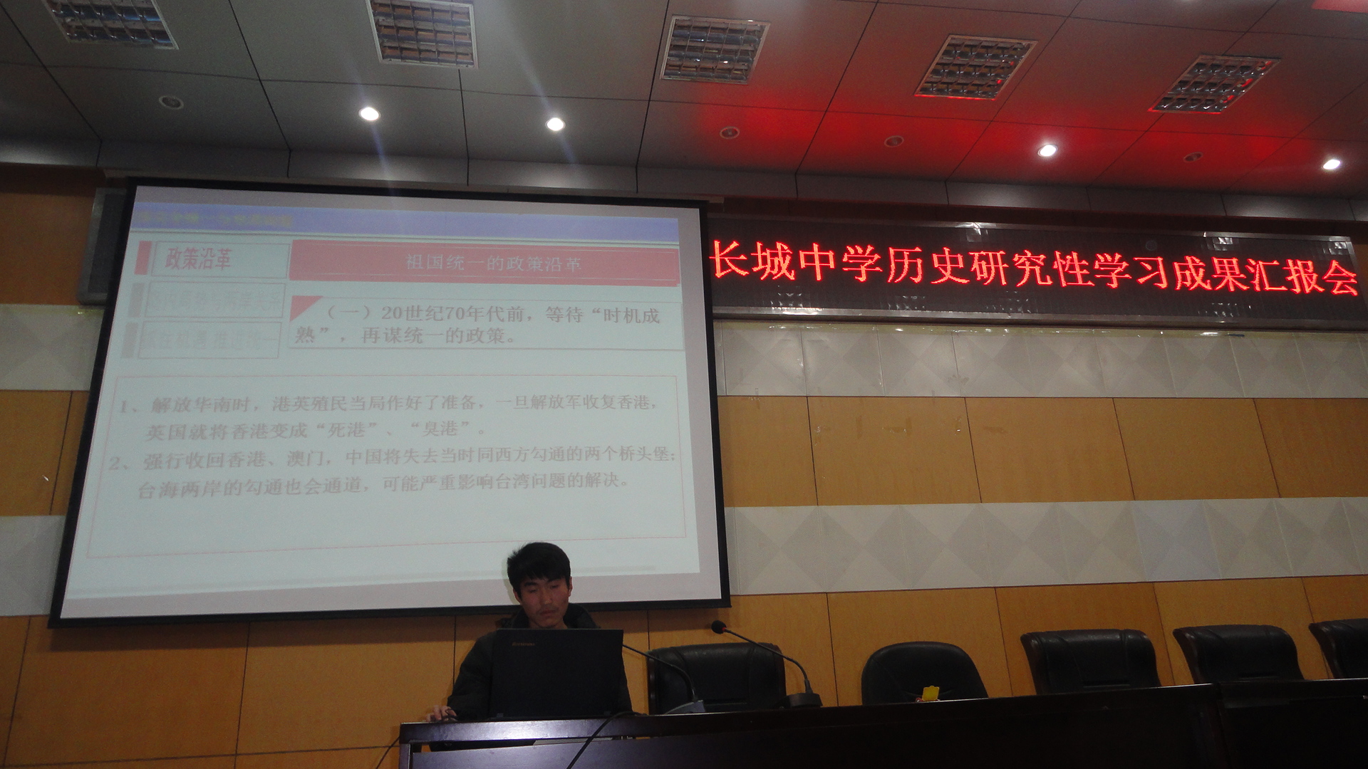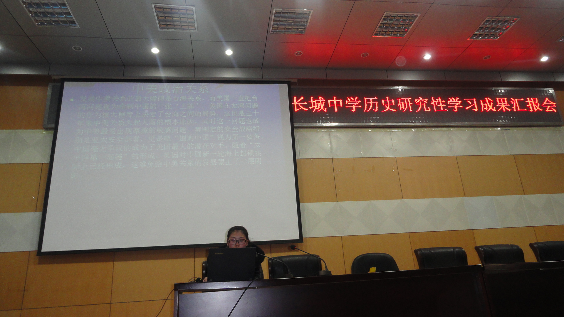 十个小组的代表按照抽签顺序上台,从“中美关系”“中日关系”“台湾问题”“世界反法西斯战争的胜利”“古代东西方政治制度的异同”等角度各选一题给大家展示,以ppt课件、结题报告、研究论文、活动记录、调查问卷等形式呈现,内容丰富,如同给大家描绘了一个个浩瀚的历史的世界。绝大多数小组研究的课题主题鲜明、观点独到、视野开阔、史料丰富、论证充分,令人耳目一新。有的小组制作的课件精美,给人带来视觉、听觉的享受和心灵的震撼。汇报者神采奕奕,着装自然大方,语言表达流畅,有的还注意与台下观众互动,表现出了较高的人文素养。