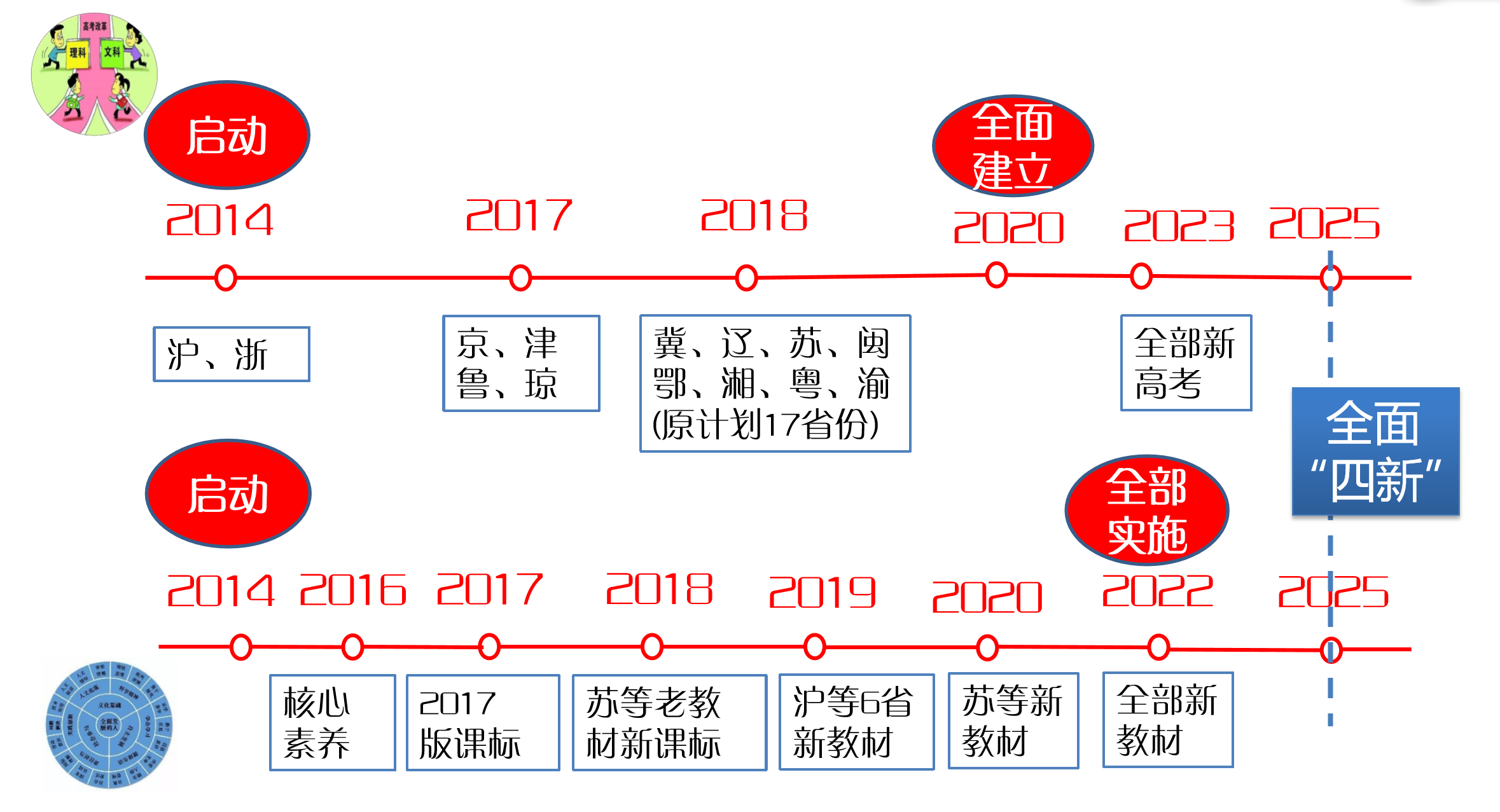 新高考从2014年上海和浙江开始尝试,强调核心素养。2017年新教材尚未问世时,北京、天津、山东、海南已经率先采用新高考。2019年底,北京和天津又声明,对于2020年高考,他们将采用自主命题方式,不用全国卷。这样2017级只有山东和海南用全国卷四。预计2023年全国全面实行新高考。