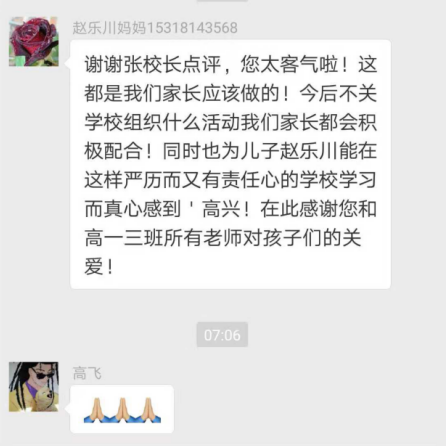 赵乐川爸爸,您辛苦了!非常感谢您的理解与付出。你牺牲个人的休息时间,到学校陪读,详细地记录了孩子们晚自主学习的情况,并为我们的工作提出中肯的建议。三班班主任高飞老师,像对待自己的孩子一样对待学生,学生也像对待自己的妈妈一样对待她。在这样其乐融融的班级大家庭里,孩子们一定会健康成长。