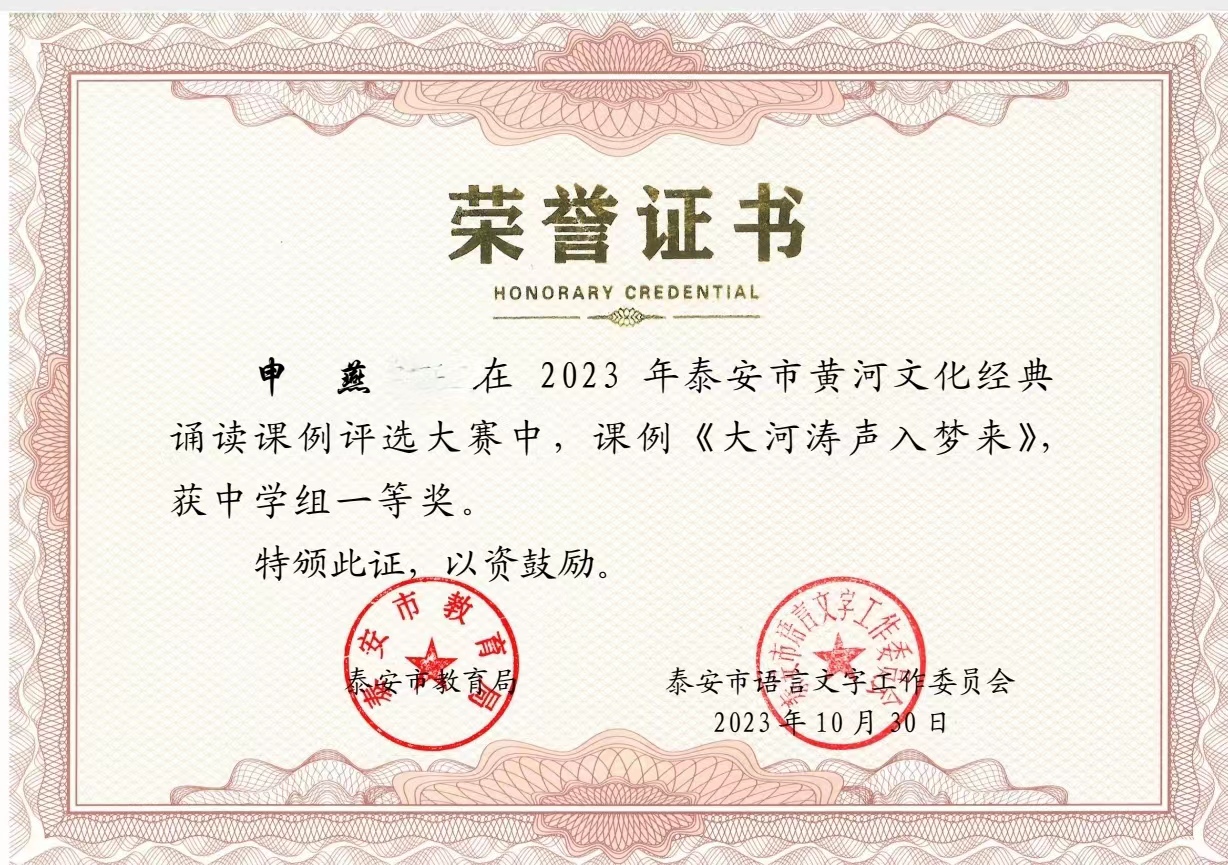 德赢天下_www.vwin01.com教师在2023年泰安市黄河文化经典诵读课例评选中获一等奖