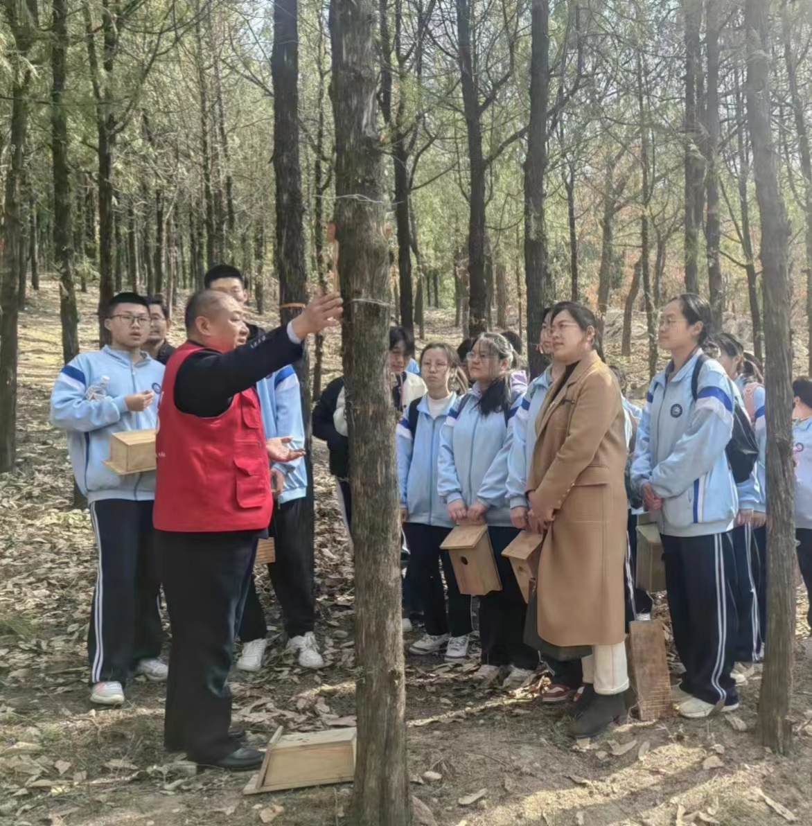 同学们走进冯玉祥纪念馆景点林区,在景区森防站工作人员的指导下用挂鸟巢的方式开展野生动植物保护宣传活动。同学们在活动中互助合作,通过设立人工鸟巢,帮助鸟类抵御初春的寒意。生物组教师向同学们发出爱鸟护鸟、从我做起的倡议,鼓励同学们积极参与野生动植物保护宣传活动,为改善泰山的生态环境质量做出应有的贡献。