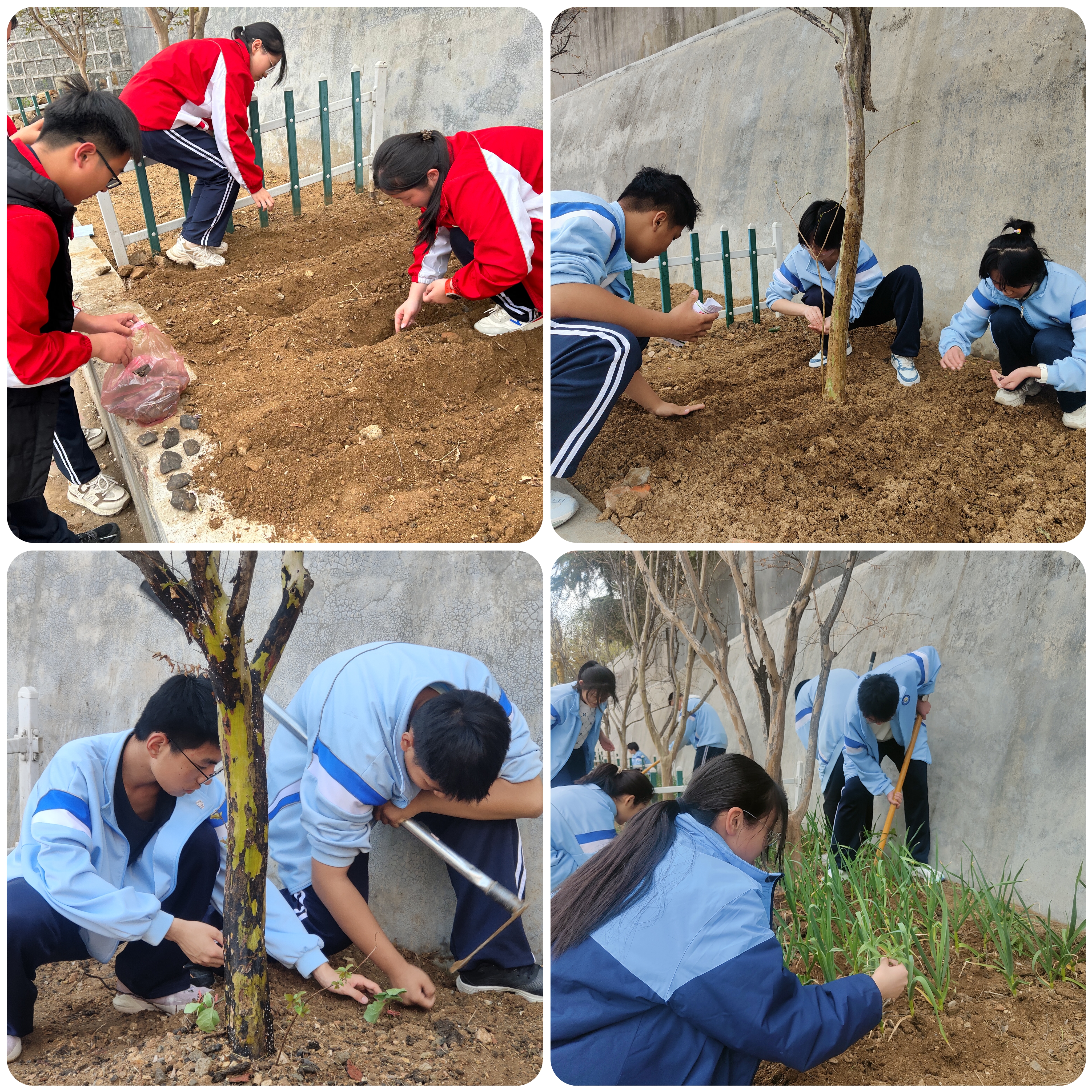每个小组对土地进行深度整理,清理田地里的石块,平整土壤,评估土壤性质,并通过查阅资料,请教老师和家长,根据时节和土壤性质科学选种,种植生菜、油麦菜、辣椒、小番茄、茄子、向日葵、土豆、绣球、花生、大豆、豌豆等作物,体验种子种植、栽培、组培、套种、轮作等不同种植方式,做好灌溉、施肥、除草等日常管理,体验劳动之苦、享受劳动之乐、感受劳动之美。