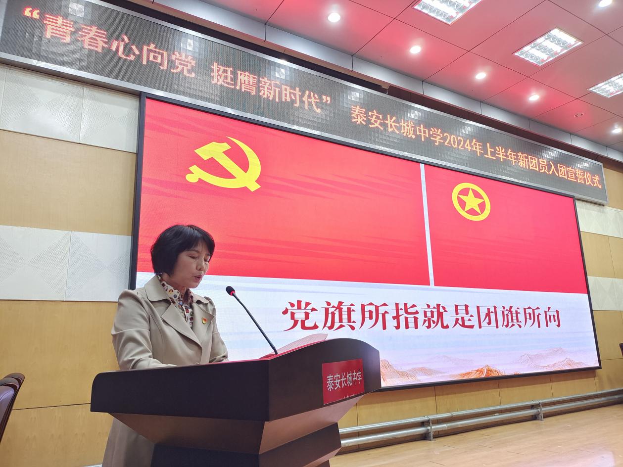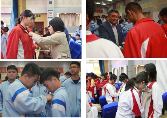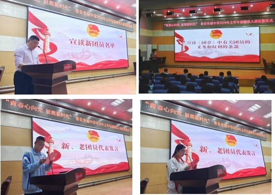 政教处主任王磊宣读2024年上半年新发展团员名单,与会领导、教师和老团员代表为新团员颁发团员证,佩戴团徽。