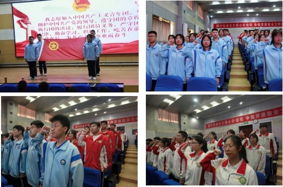 在曹瑞老师的带领下,全体团员高举右拳面对鲜艳的团旗庄严宣誓,铮铮誓言充满了青春的激情和对未来的美好憧憬,彰显了团员们的坚定信念。
