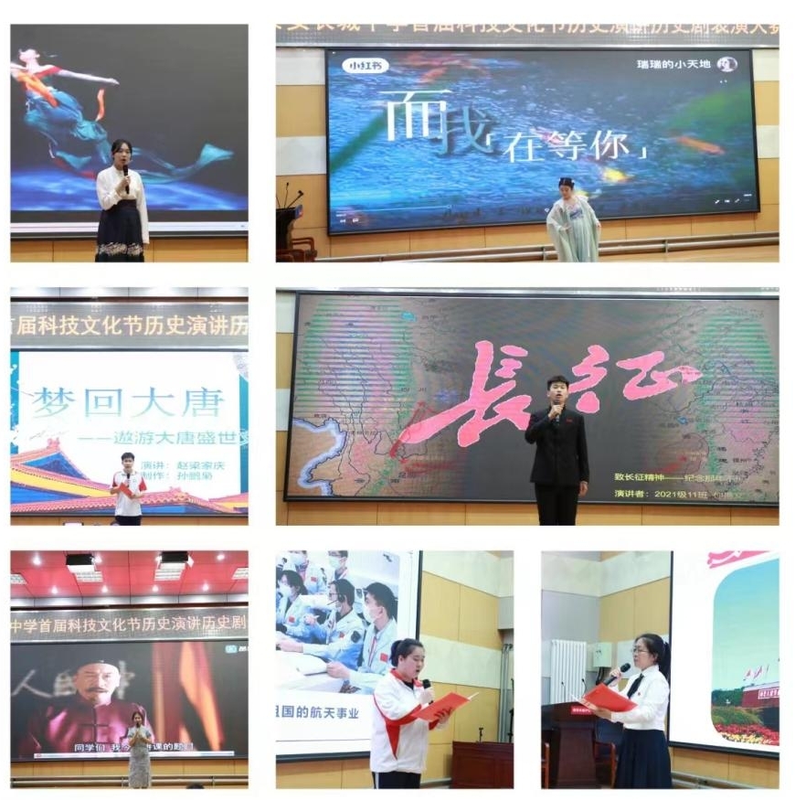 在成果展示和汇演中,历史演讲社团的学生们带领师生穿越时空,在历史长河里畅游:《梦回大唐,遨游大唐盛世文化》展现了璀璨的唐代文化,凸显了中华文化的魅力及其在世界文化中的地位;《传千年之经文,燃万古之明灯》翻开了一页页中华文化经典,积淀着智慧的结晶,映射着理性的光辉;《因缘相会,同文化共勉》和《沐文化之光,创人生价值》让师生领略到了历史和传统文化之美;《巾帼不让须眉——秋瑾》和《敬自由与爱,敬伟大坚韧的女性》回顾了中国女性的丰功伟绩,诠释了女性的能量和魅力;《云山苍苍,江水泱泱,先生之风,山高水长》展现了陈独秀先生的不屈傲骨和先进思想,在中国近代史上书写了浓墨重彩的一笔;《致长征精神——纪念那不远万里的岁月蹉跎》用红军长征的伟大历程鼓舞着中华儿女建设祖国的雄心壮志;《承抗美援朝精神,做新时代先进青年》彰显了抗美援朝的现实意义和时代价值;《用青春砥砺梦想,让事业薪火相传》传承了红色基因,引导青少年学子感恩报国。