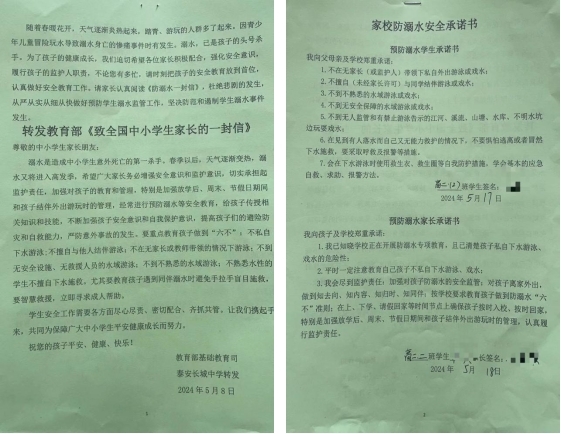 5月17日,政教处牵头,下发致家长的一封信,各班与学生签订防溺水学生承诺书,与家长签订防溺水家长承诺书,切实做好家校沟通,不断提高家长安全意识,推动落实家长安全监护职责。