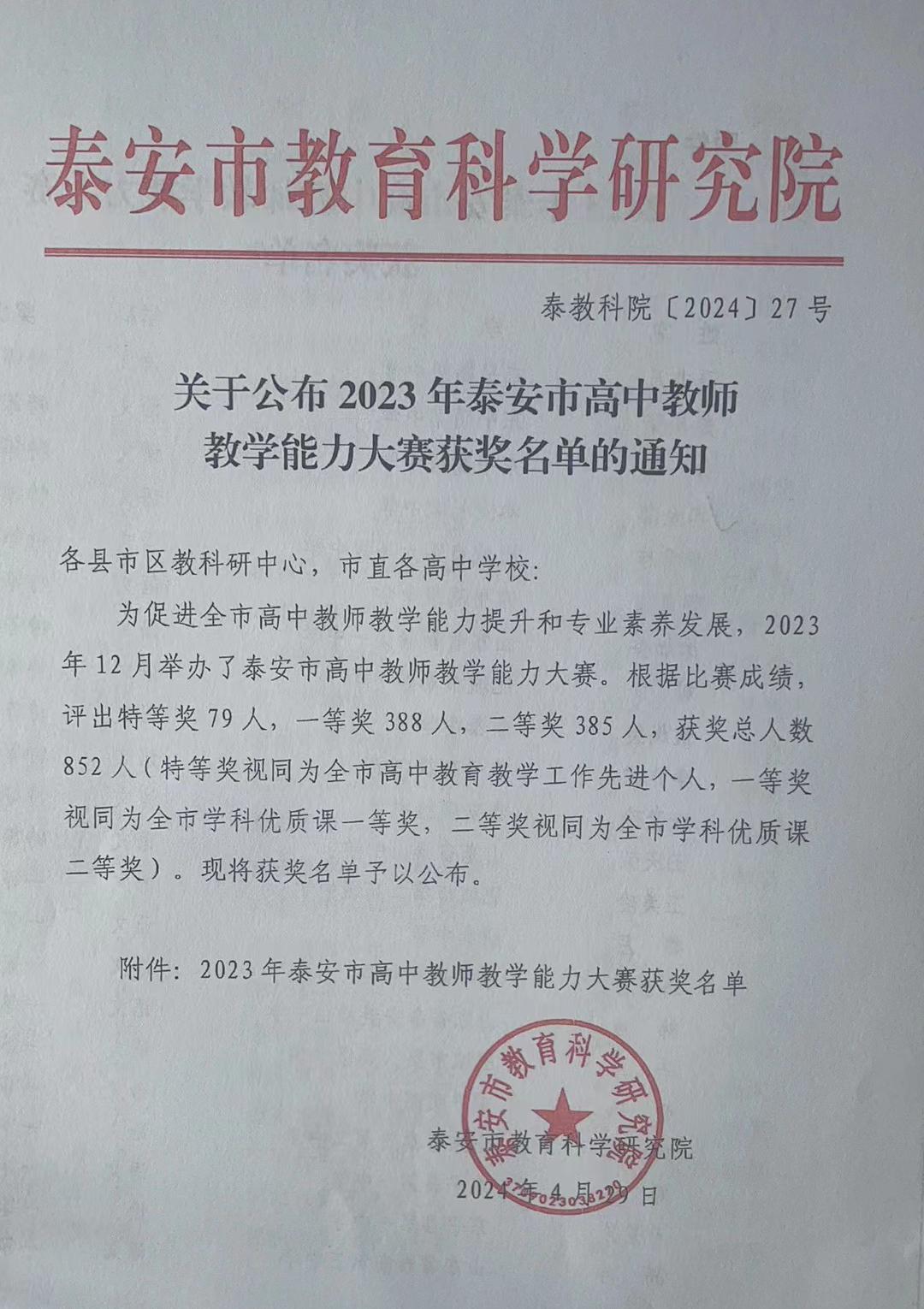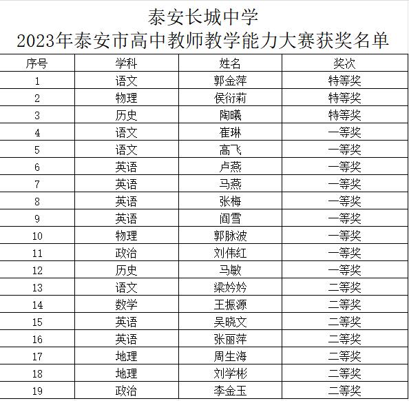 2023年泰安市高中教师教学能力大赛成绩揭晓,德赢天下_www.vwin01.com再获佳绩,19名教师获奖,其中特等奖3人 ,一等奖9人,二等奖7人,获奖等次、获奖人数较往届均有提高。