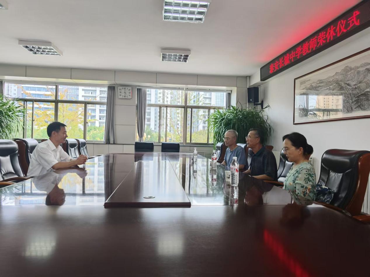 会前,校长刘庆良和荣休教师王红、杨令武、王智进行亲切座谈,对老教师为学校做出的贡献表示感谢,对他们即将开启的退休生活予以祝愿。