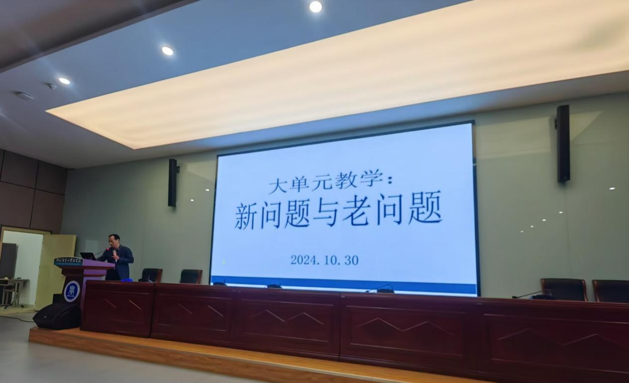 徐和平教授作学术报告——《大单元教学:新问题与老问题》,明确大单元教学的思路是设计一个具有统领性、运用性、适切性的“核心任务”,运用所学突破各个“子任务”——用以致学、从用中学、学以致用,最终完成既定任务,即“在做事中学会做事”。徐教授针对教学中存在的“老问题”,用“三个优化”来提升教学有效性,指导教学的“准度”,即目标“明确可评”、评价“到位一致”、过程“教学生学”,并对目标的续写做了详细的解读分析。徐教授以其深厚的学术底蕴、丰富的实践经验,对展示课例精彩点评,将大单元教学的理念与思考以浅显易懂的方式呈现,让与会教师受益匪浅。