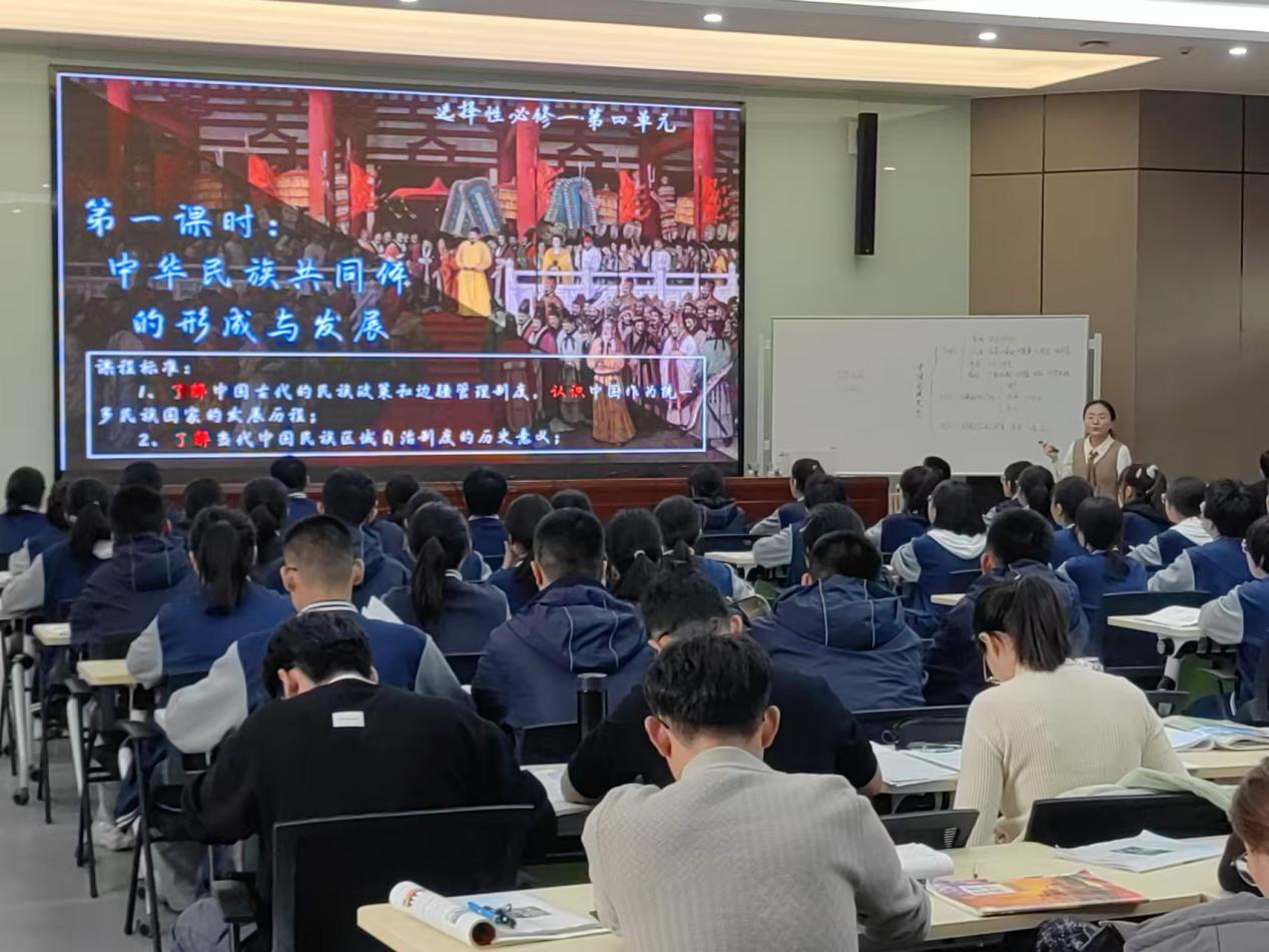 历史教研组组长马敏首先汇报基于历史学科核心素养的大单元教学设计解读,从引领性学习主题、素养导向性目标、挑战性学习任务、持续性学习评价四个方面,分享选择性必修一第四单元《民族关系与国家关系》整体设计思路。