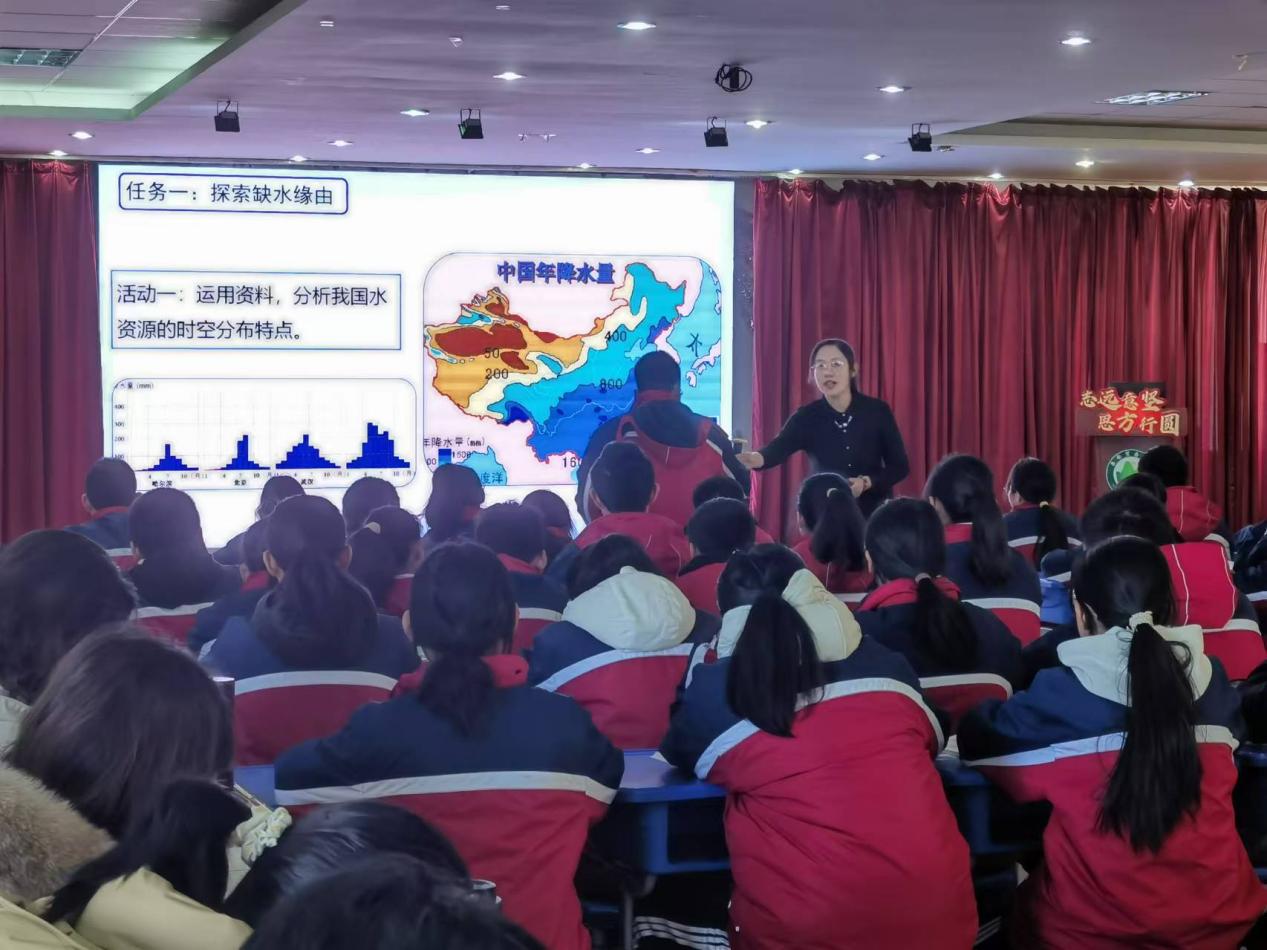 泰安望岳中学地理教研组陈文燕老师展示新授课——《水资源》,运用地理学科的“第二语言”—地图,引导学生活用地图,观其“图”而知其“地”,知其“地”而求其“理”。陈老师引导学生从中国气候图与中国水资源分布图中探索我国缺水缘由;从中国河流分布图和中国南水北调图中寻求用水之策;依托泰安的河流分布图助力泰安发展,让学生为泰安的水资源利用提出可行性建议;学生通过角色扮演,认识到水资源的重要性,进而树立正确的资源观,养成节约用水的好习惯。