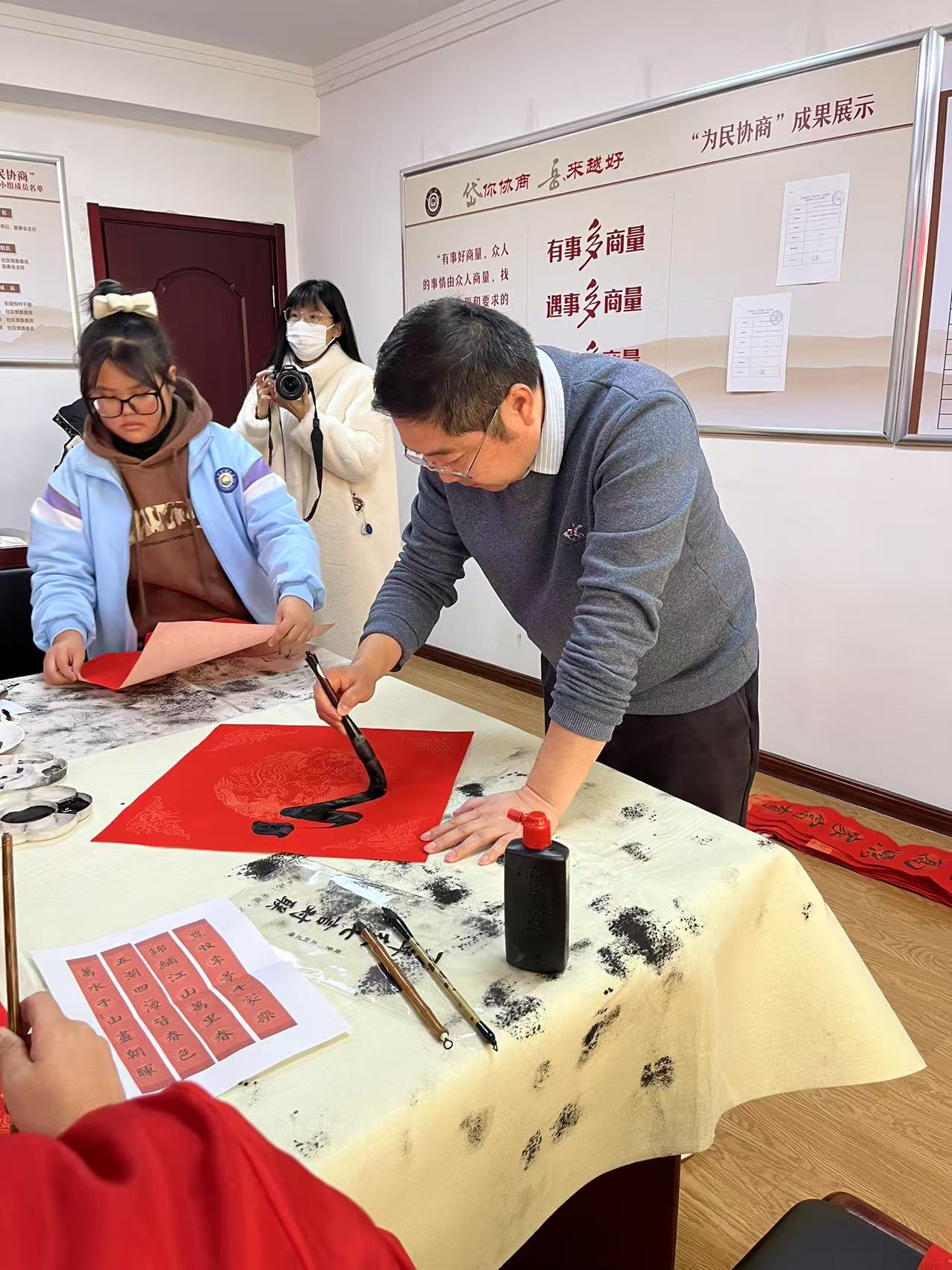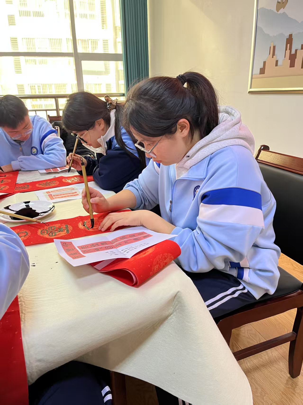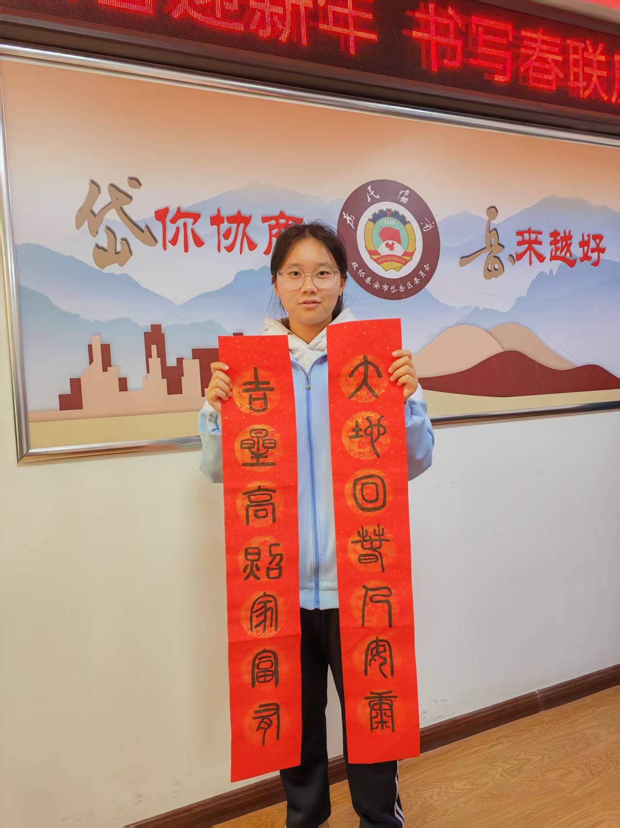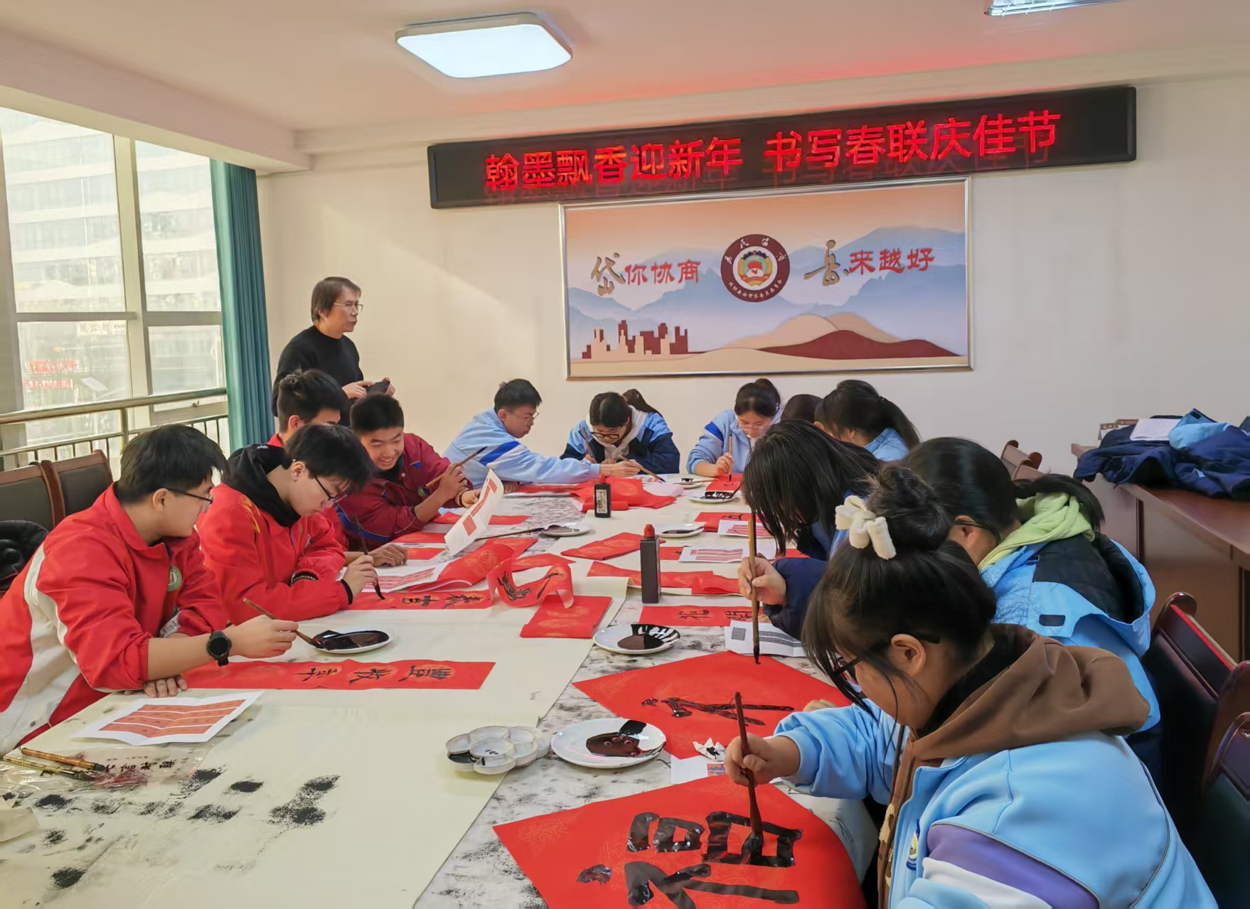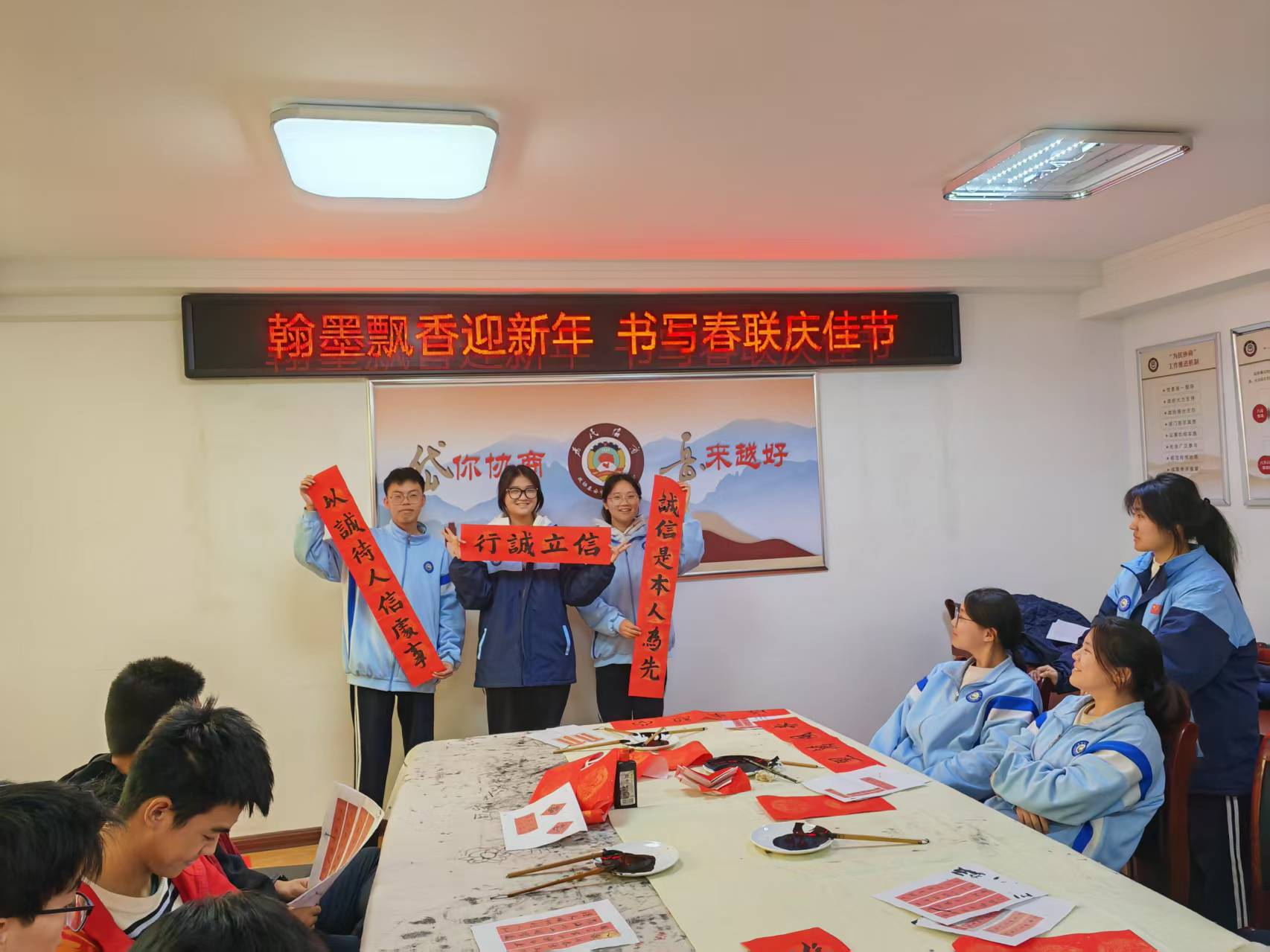 活动现场,墨香四溢,师生们将对新年的美好祝愿融入笔端,挥毫泼墨,笔走龙蛇,苍劲有力的楷书、灵动飘逸的行书、古朴典雅的隶书……一幅幅寓意平安和谐、吉祥如意的对联,书写出对新年的美好憧憬。
