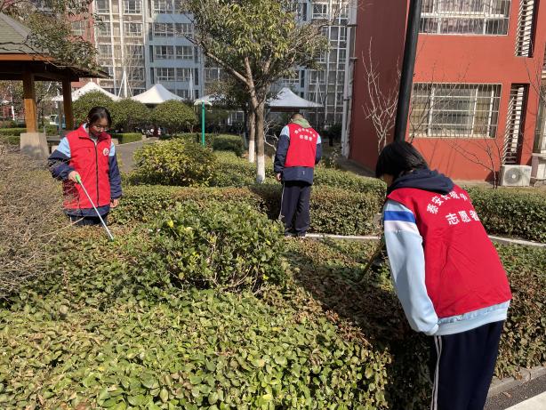 四组学生拿着夹子和垃圾袋,对社区进行“地毯式”清理。高一(8)班陈梦娇同学从绿化带中捡出烟头、纸屑后感慨道:“维护环境真不容易,以后我一定带头不乱扔垃圾!”