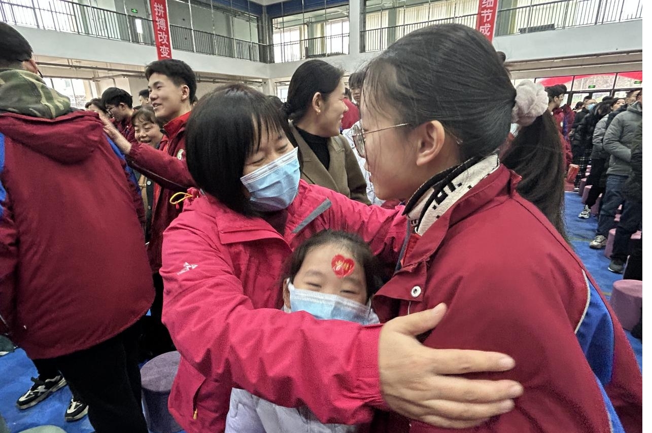 学生与家长互送祝福,紧紧相拥,传递温暖,寄予期望。