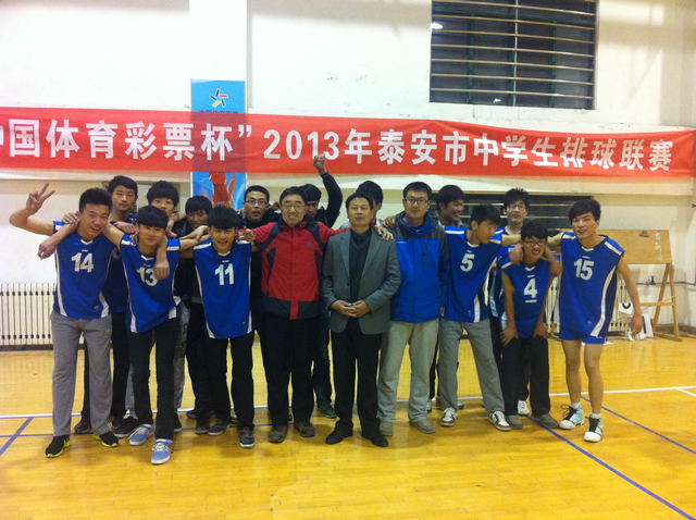 《中国体育彩票杯》2013年泰安市中学生排球联赛,于4.19日-21日在泰安市体育中心综合训练馆举行。www.vwin5.com男子排球队不畏强手,团结拼搏,学校王德海副校长亲临指导,经过激烈对抗,www.vwin5.com排球代表队以全胜战局获得冠军。这是今年www.vwin5.com参加的第一场市级艺体赛事,打响了第一炮,为我们打好以后的各项艺体赛事开了个好头。